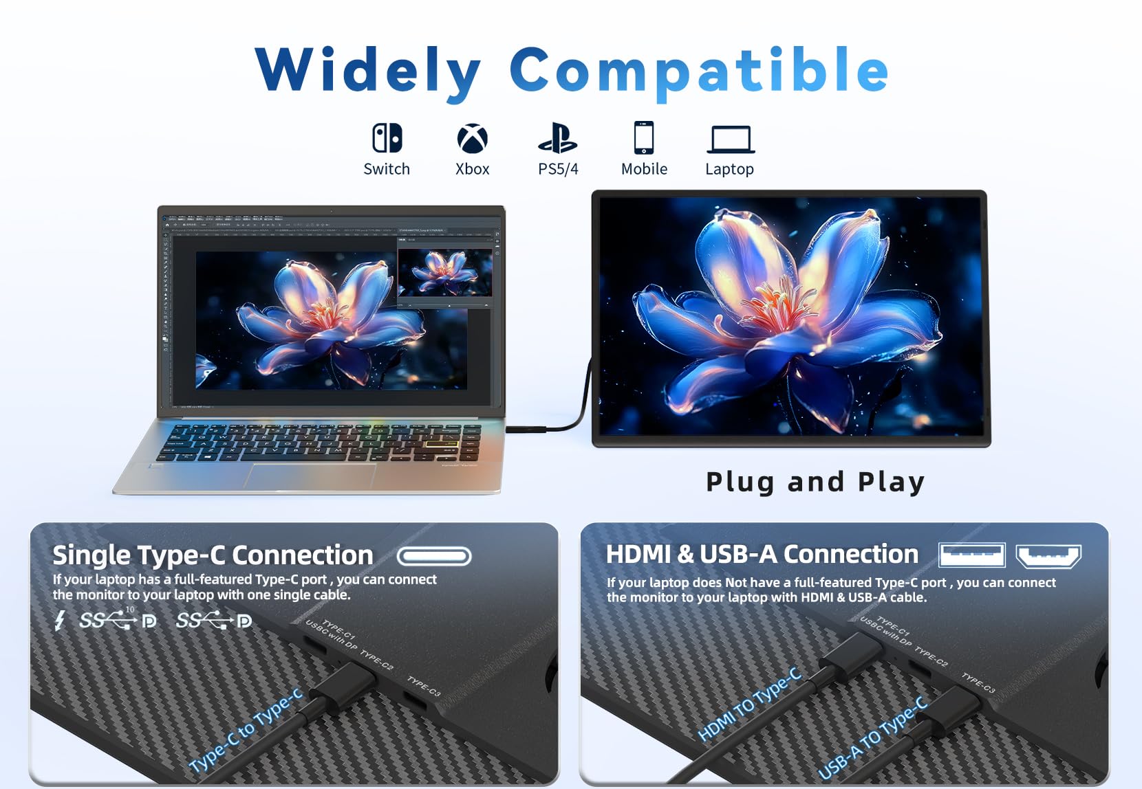 - 【Wide Compatibility & Reverse Charging】This portable laptop monitor connects easily with three ports: 2 full-function Type-C ports (Type-C2 and Type-C3) and 1 Type-C port for HDMI input (Type-C1 with DP): Computers with full-function Type-C can connect via Type-C2/C3. Computers with HDMI and USB A/C can connect by HDMI to Type-C1 and a cable to Type-C2/C3. Phones, gaming consoles, and tablets with full-function Type-C can connect directly to Type-C2/C3. Devices without full-function Type-C need an adapter (not included). It also supports reverse charging, allowing you to power the monitor and charge your device simultaneously using a charger with our cable connected to Type-C2/C3 port.