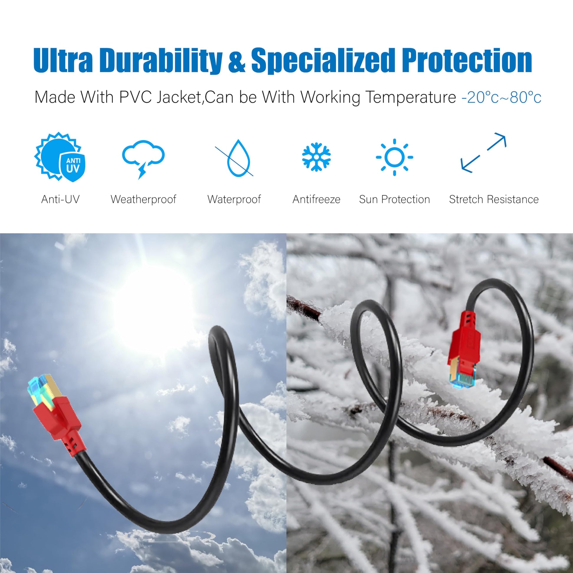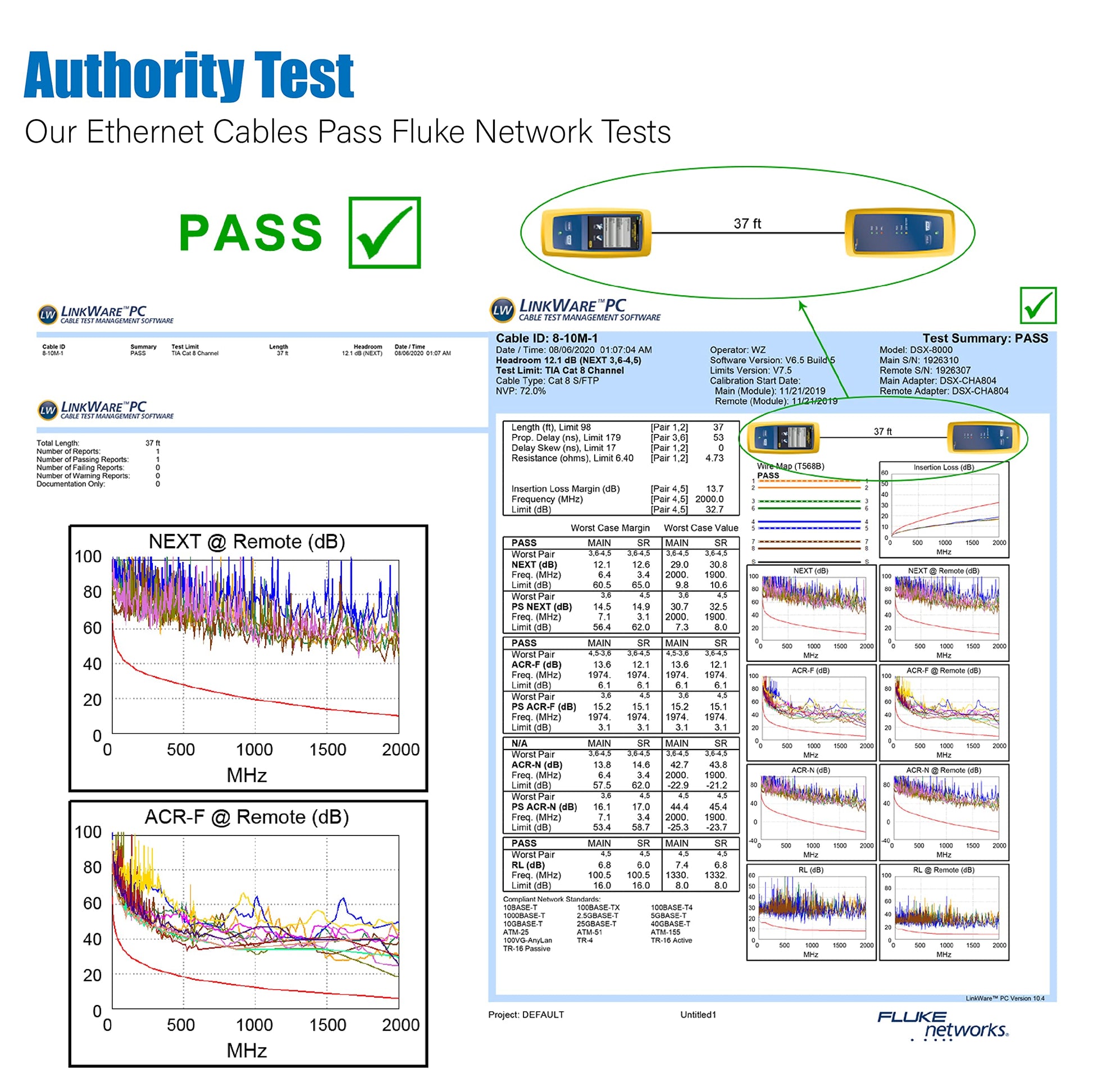 - Weatherproof & UV Resistant & Fluke tested:Cat8 cable is waterproof, anti-corrosion, more durable and flexible,the outer layer is shielded by high-quality UV-resistant PVC sheath. it can withstand direct sunlight and extreme cold, humid and hot weather, suitable for outdoor/indoor and heavy duty work.Tested with Fluke professional Cable Analyzers and all of our Cat8 cables have been tested by fluke professional cable analyzers.