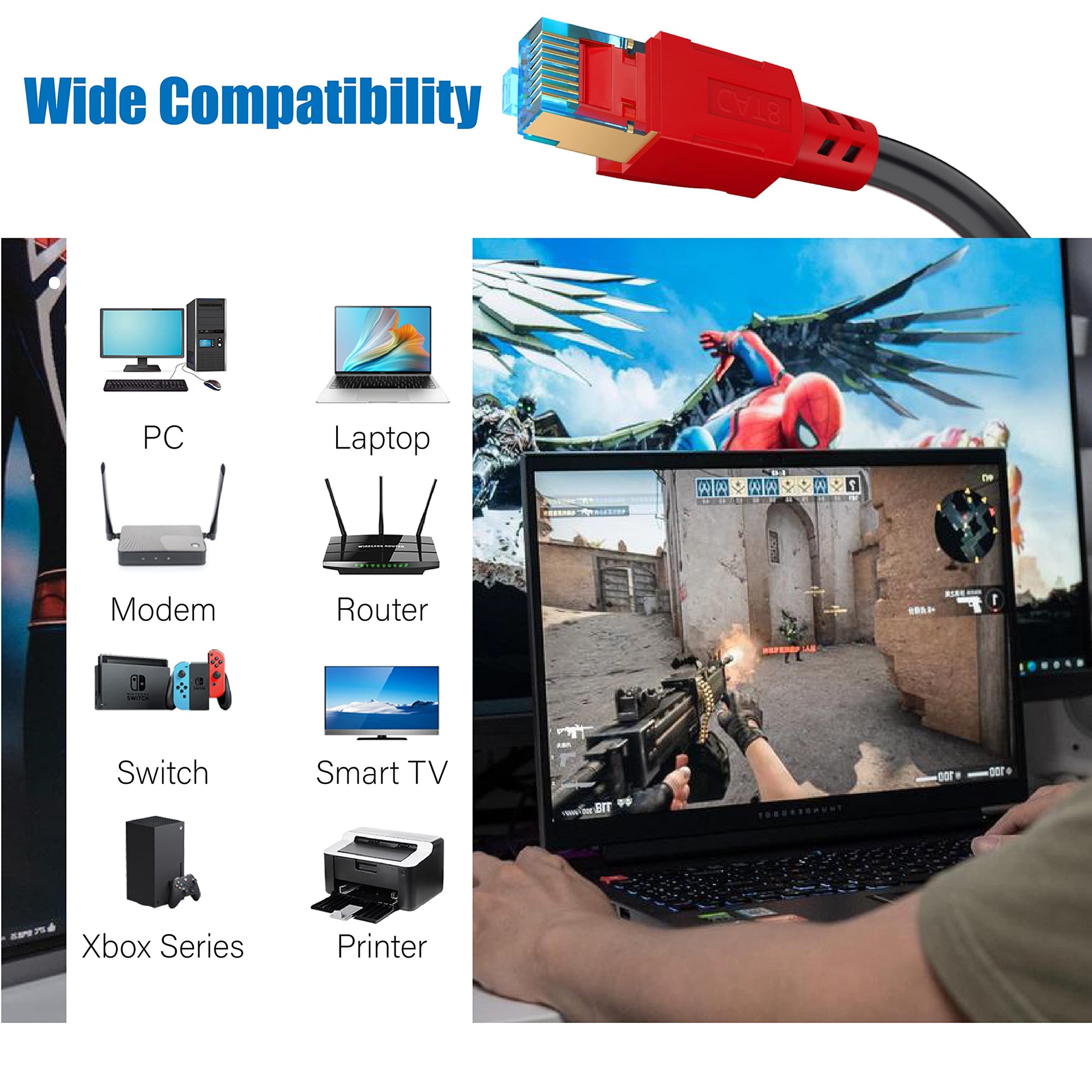 - Widely Used & RJ45 Connectors:Cat 8 Ethernet Cable with two shielded RJ45 connectors at both ends,Perfect for networking switch,routers,ADSL,network adapters,hubs,modems,PS3,PS4,PS5,NAS,IP Cam,Mac,Laptop,coupler,x-box 360 gaming stations,printers,patch panels,Keystone jack,smart TV and other device with RJ45 connectors.It is suitable for small or middle enterprise LANs, especially for data center switch-to-server interconnections.