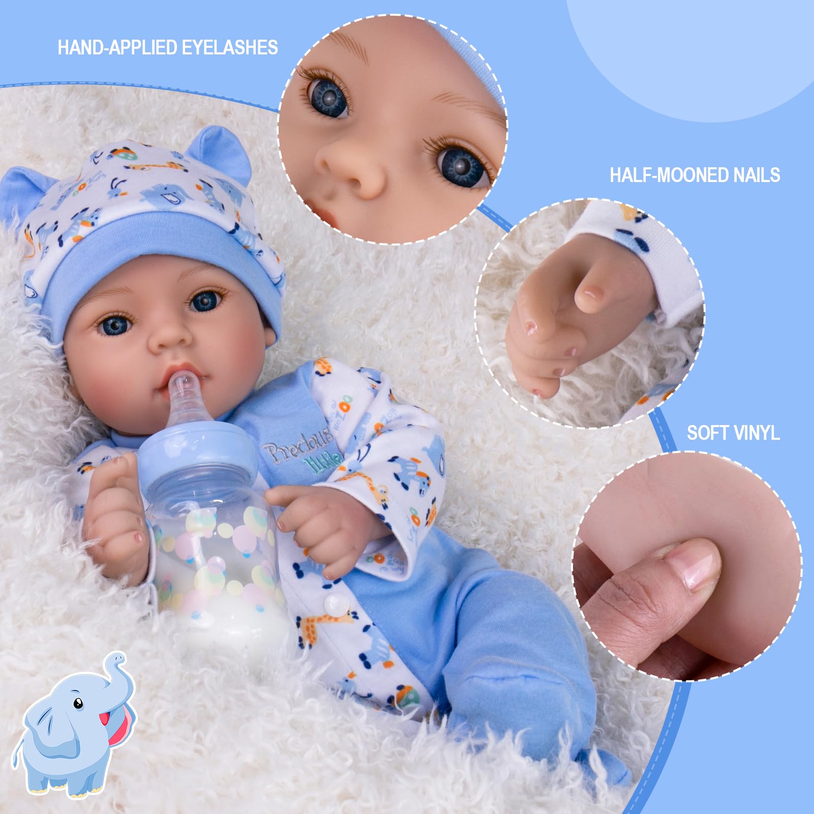 - 6 PIECE PLAYFUL SET - Cuddly reborn baby boy doll,blue onesie, blue hat, diaper, feeding bottle, pacifier.
