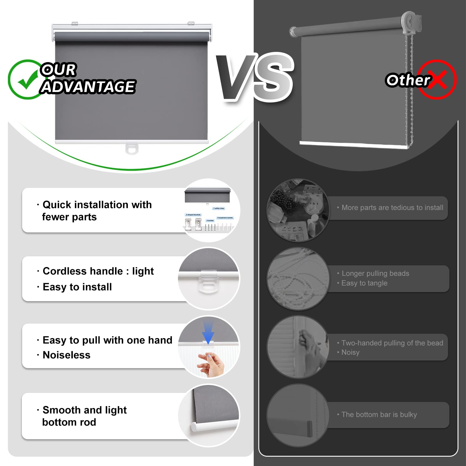 - 【New Innovative Design】: The cordless design is safer for kids and pets. The cordless roller blinds are more convenient than corded roller blinds. Built-in the robust spring-loaded mechanism, which has passed 5,000 times usual lifting or pulling down tests for each blind, You can stop the shade wherever you want smoothly. Open the roller blind, pull it to the place; Shut the roller blind, you can gently pull the buckle, and the roller blind would automatically close.