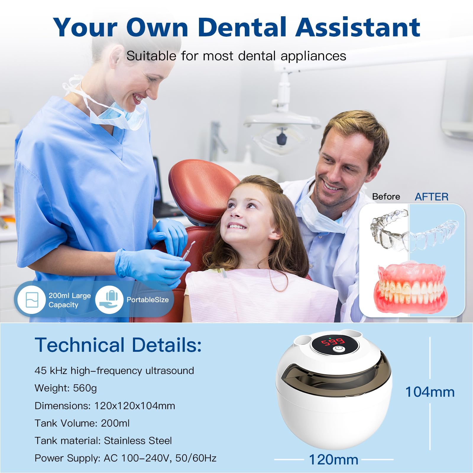 - 【Utility & Made to Last】: Retainer cleaner machine is built from ABS plastic or insulated SUS 304 stainless steel, which makes it both firm and safe. Ensure 200 ml capacity but very compact for on-the-go use(size: 4.72*4.72*4.21 in, weighs: 0.73 lb). Also equipped with a basket and tweezers as jewelry cleaner, for easy cleaning of jewelry or waterproof watches