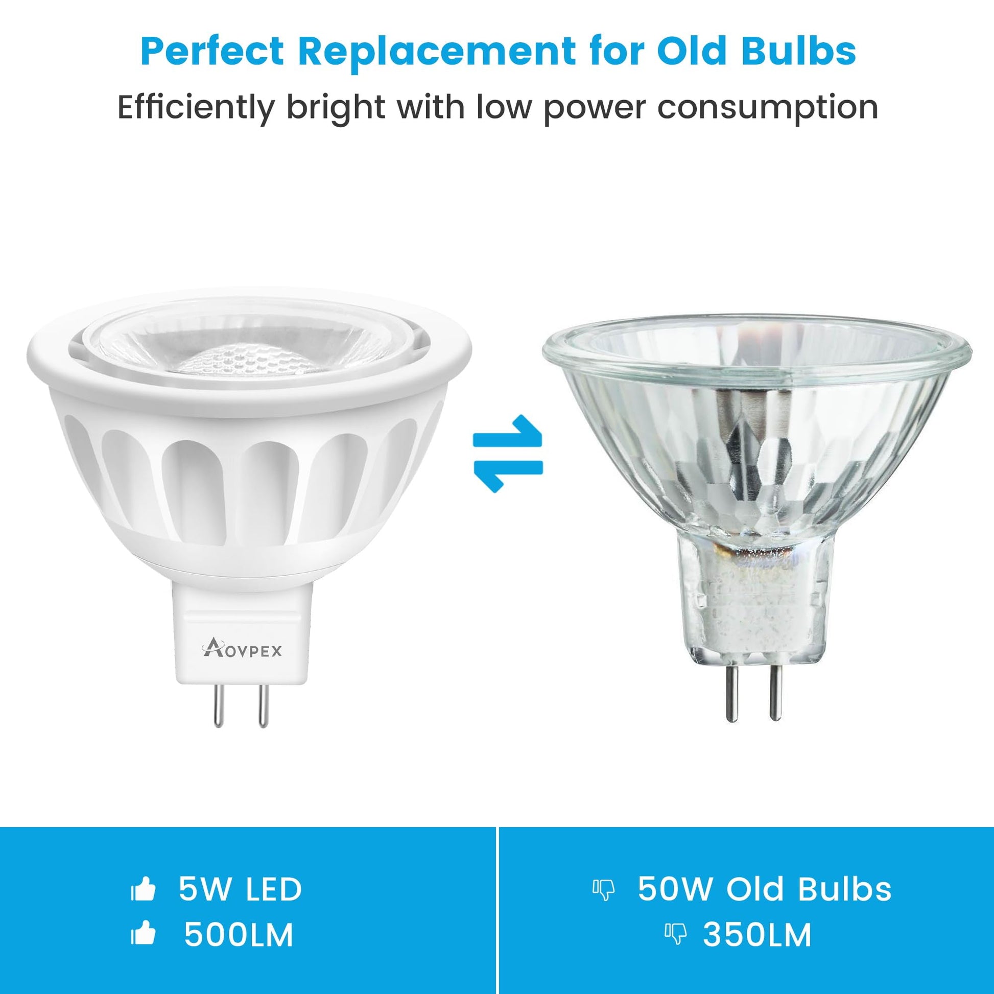 Aovpex 10 Pack Dimmable MR16 LED Bulbs, 12V 5W(50-Watt Equivalent), 3000K Warm White, GU5.3 Bi-Pin Base, 40-Degree, Indoor/Outdoor Landscape Spotlight Track Recessed Lighting