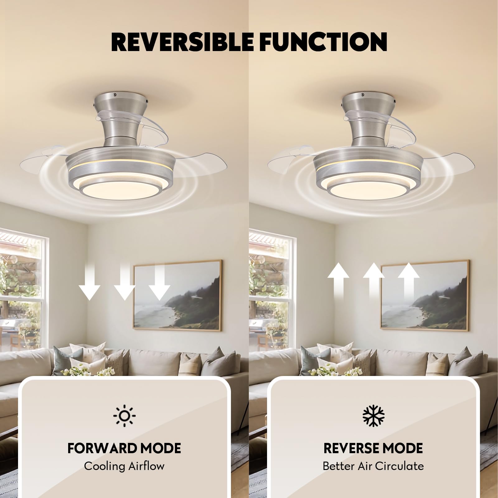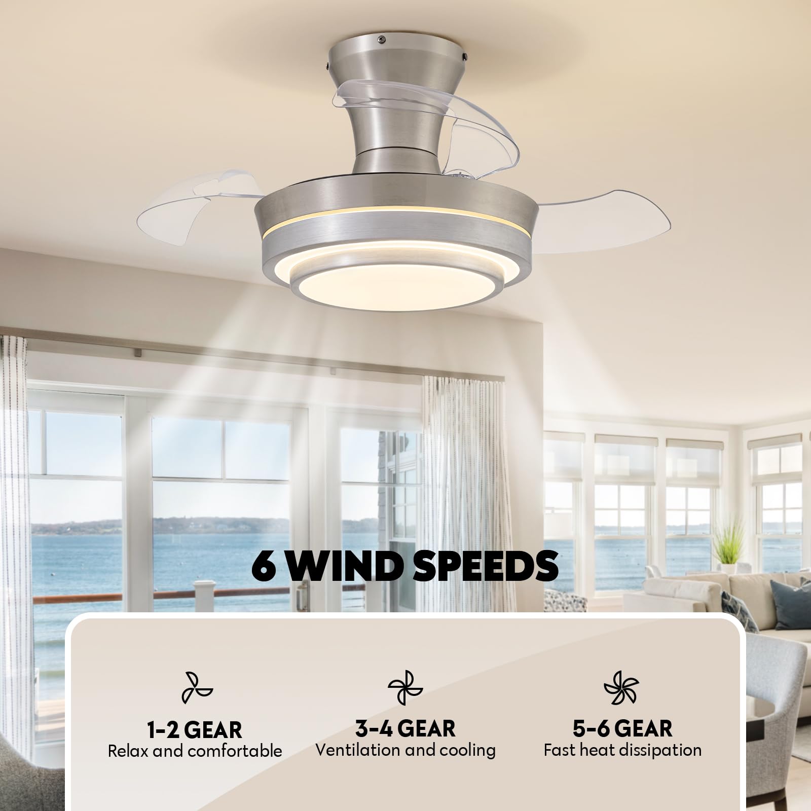 APBEAMLighting Retractable Small Led Ceiling Fan with Light and Remote 28 Inch Low Profile Brushed Nickle Modern Fandelier for Bedroom Living Room Dimmable 6 Speed Reversible Smart Ceiling Fan