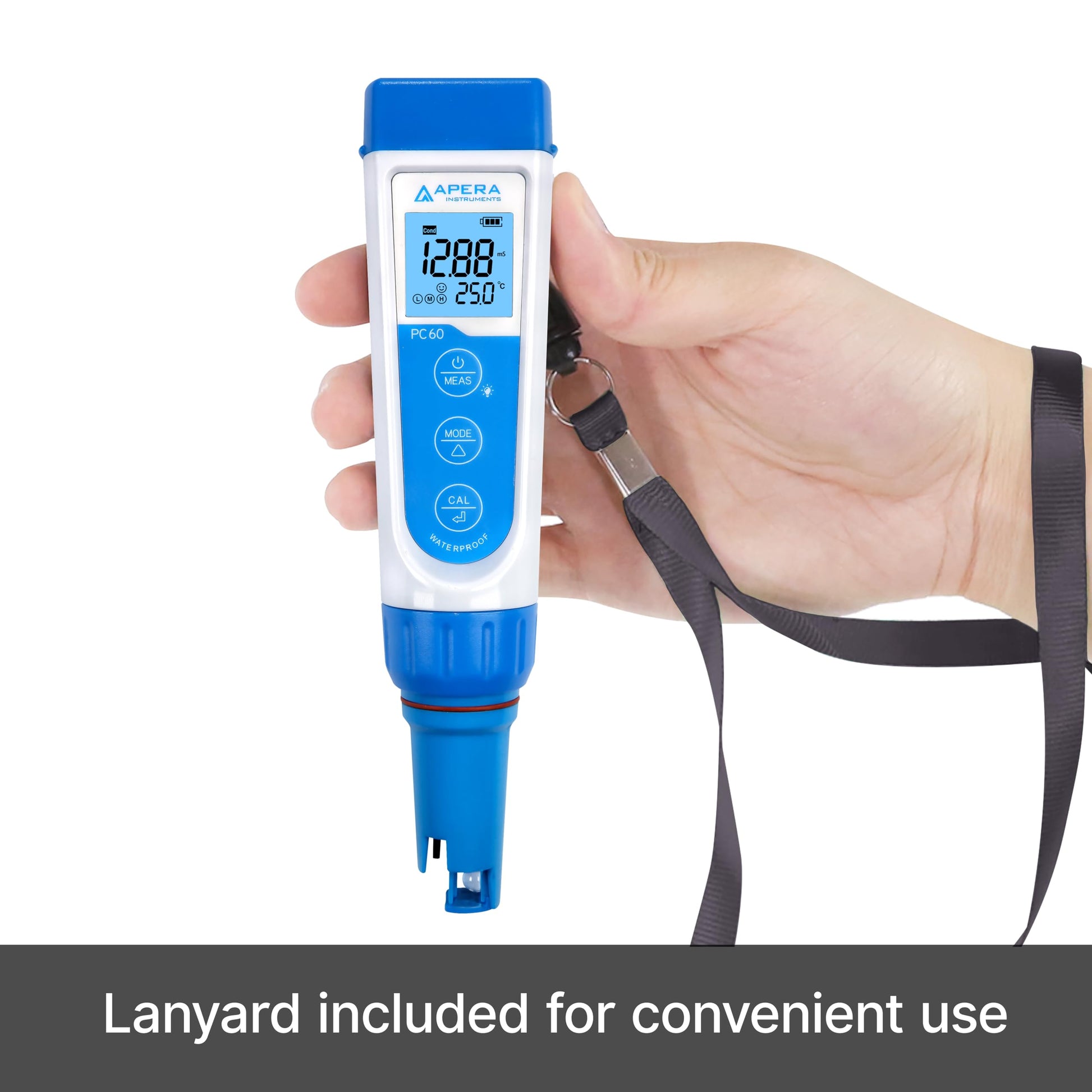 Details: The Apera Instruments PC60 Multi-parameter Tester simply tests pH, EC (conductivity), TDS (ppm), salinity (ppt) &temperature in a highly quick & professional manner for all kinds of general water solutions such as hydroponics, horticulture, aquaculture, pools& spas, drinking water, water treatment, cooling towers, environmental monitoring, education, etc. The multi-parameter probe is replaceable and easy to install. 1 to 3 points of Auto Calibration and 0 to 50˚C Auto Temperature Compensation (ATC), 0. 01 pH, 1% F. S, 0. 5˚C accuracy with -2. 00 to 16. 00 pH & 0 to 20. 00 mS/cm measuring range, auto recognition and reminders of stable values improves consistency, saving you the trouble of guessing when to manually hold measurement (auto. hold function available). Easy menu setting, customizing your tester’s functions according to your needs. Smart self-diagnosis, warning of out-of-range measurement and incorrect calibrations. IP67 waterproof and dustproof, floating on water so you don’t have to worry if it falls into water by accident. Up to 1000 hours' continuous operation (without backlit) powered by AAA batteries (with low power warning and auto power off in 8 min if no operation)es with a complete kit of premixed calibration solutions (4. 00 and 7. 00), soaking solutions (3M KCL), calibration bottles, AAA batteries, and a lanyard all in a portable carrying case. The meter is CE certified and comes with a 2-YEAR (6 months for the probe). NOTES: The instrument will NOT perform well for distilled or deionized water's pH measurement ( works well for conductivity). This is because distilled and deionized water do not have enough ions present for the electrode to function properly in pH measurement. To measure distilled or deionized water’s pH, users need to use a specialized pH meter such as Apera SX811-PW. Do NOT store the probe in distilled water or deionized water because they will cause damage to the glass membrane of the pH probe. Only use distilled water for rinsing the probe. Refer instruction manual before use.