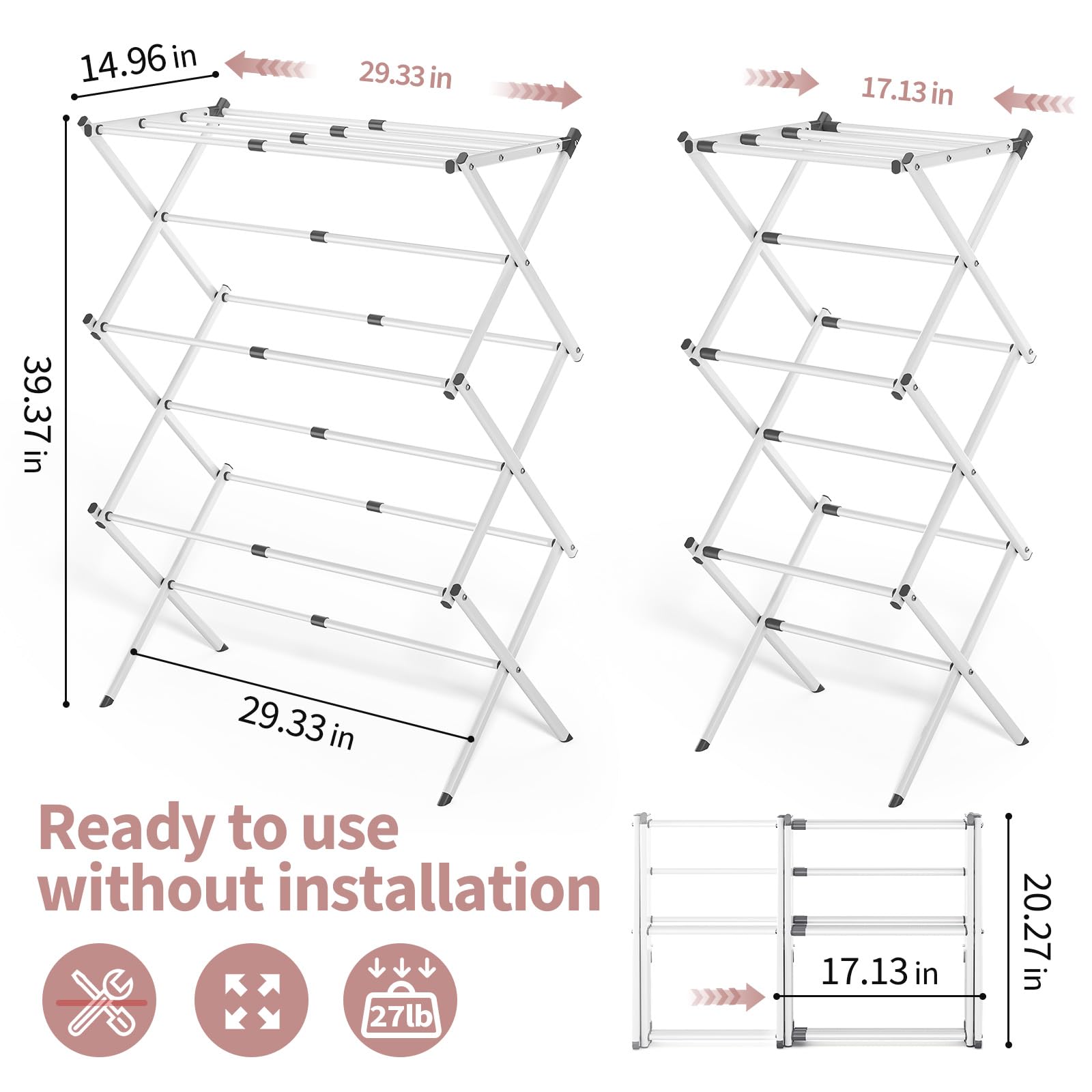 - Instant Use: With no tools required, this clothing drying rack can be set up quickly and easily straight out of the box. Simply pull up the rack and ensure it is locked in place. For more drying space, expand the rack before pulling it up.