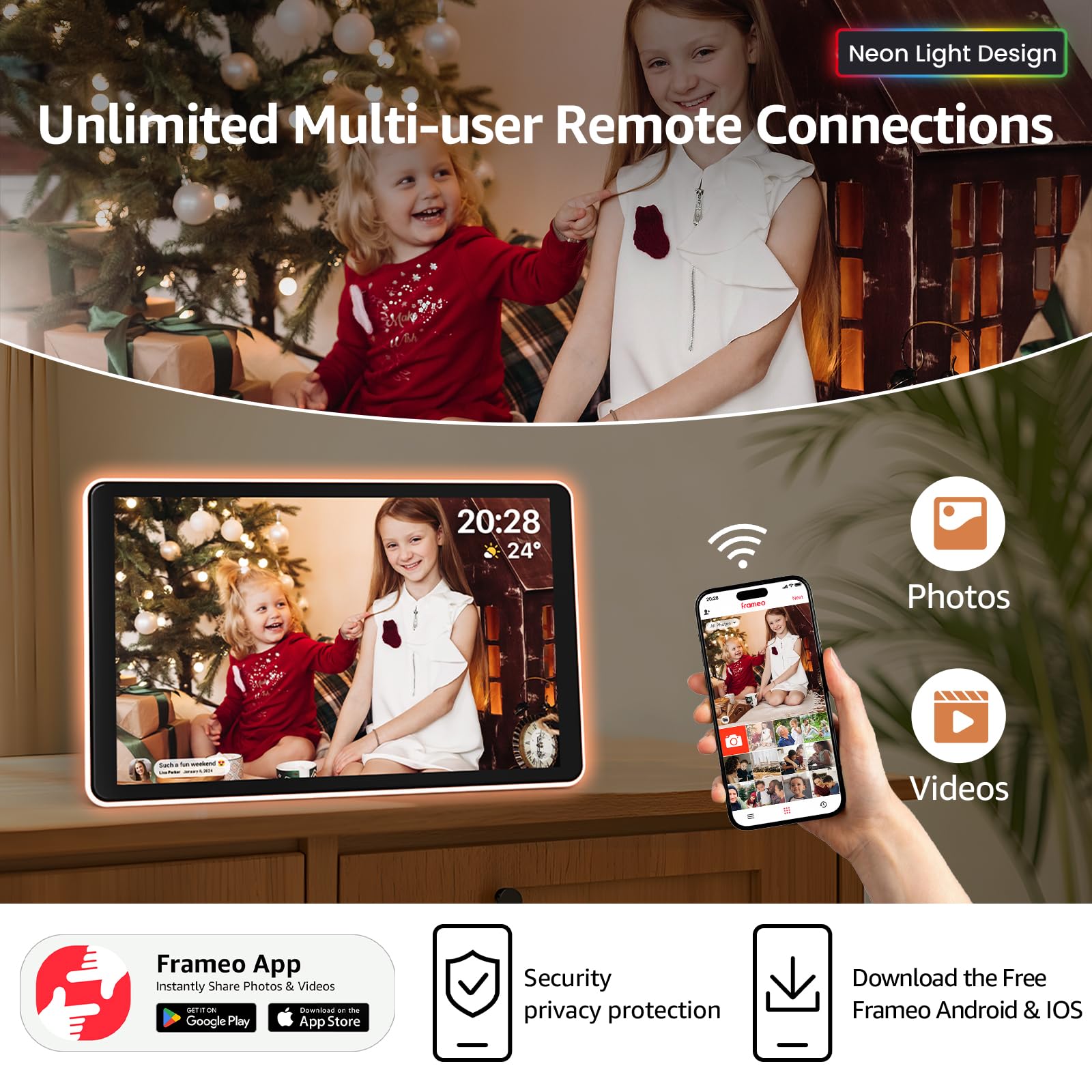 - [Experience Stunning Visuals]: Step into a world of vibrant detail and crystal-clear images with the Apolosign Neon Light digital photo frame. Featuring a 16:10 aspect ratio and a 1280x800 Full HD 2.5D glass touch screen, this frame delivers exceptional clarity and immersive depth. The advanced 2.5D glass lamination ensures that every photo you display comes to life with enhanced brightness and vivid detail.