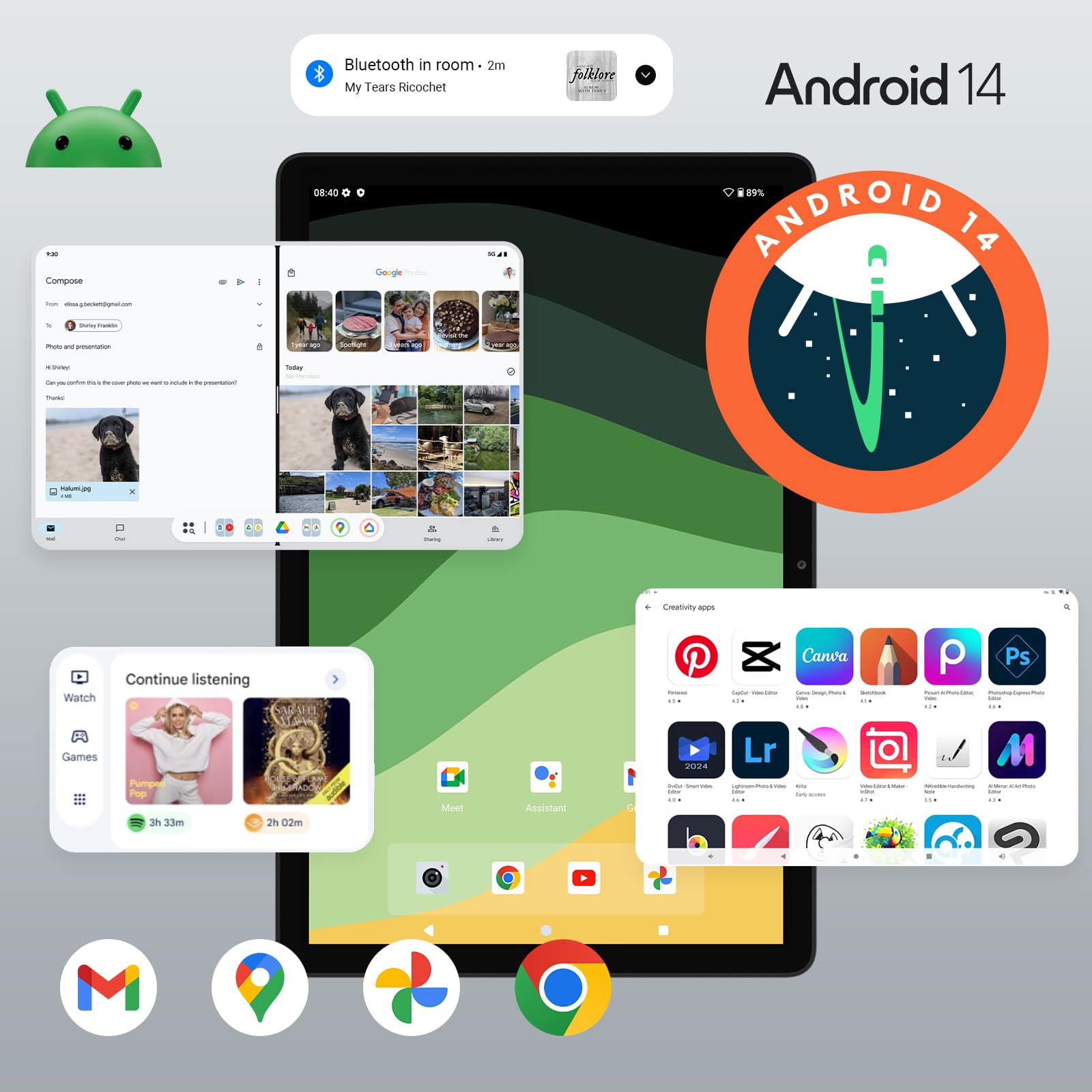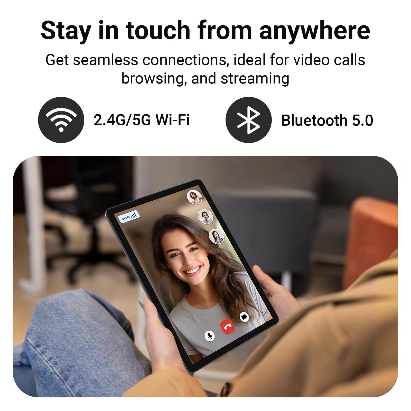 - 2.4G/5G Dual-Band WiFi, 5MP + 8MP Dual Cameras: The Android 14 tablet supports 2.4/5GHz dual-band WiFi for a more stable and faster network connection. The EP1095T Tab 11 tablet features Bluetooth 5.0, ensuring quicker and more stable wireless connections. Pair with Bluetooth headphones, speakers, and more for high-quality audio. It's equipped with a 5MP front camera and an 8MP rear camera, allowing you to capture clear photos and videos to document your wonderful moments