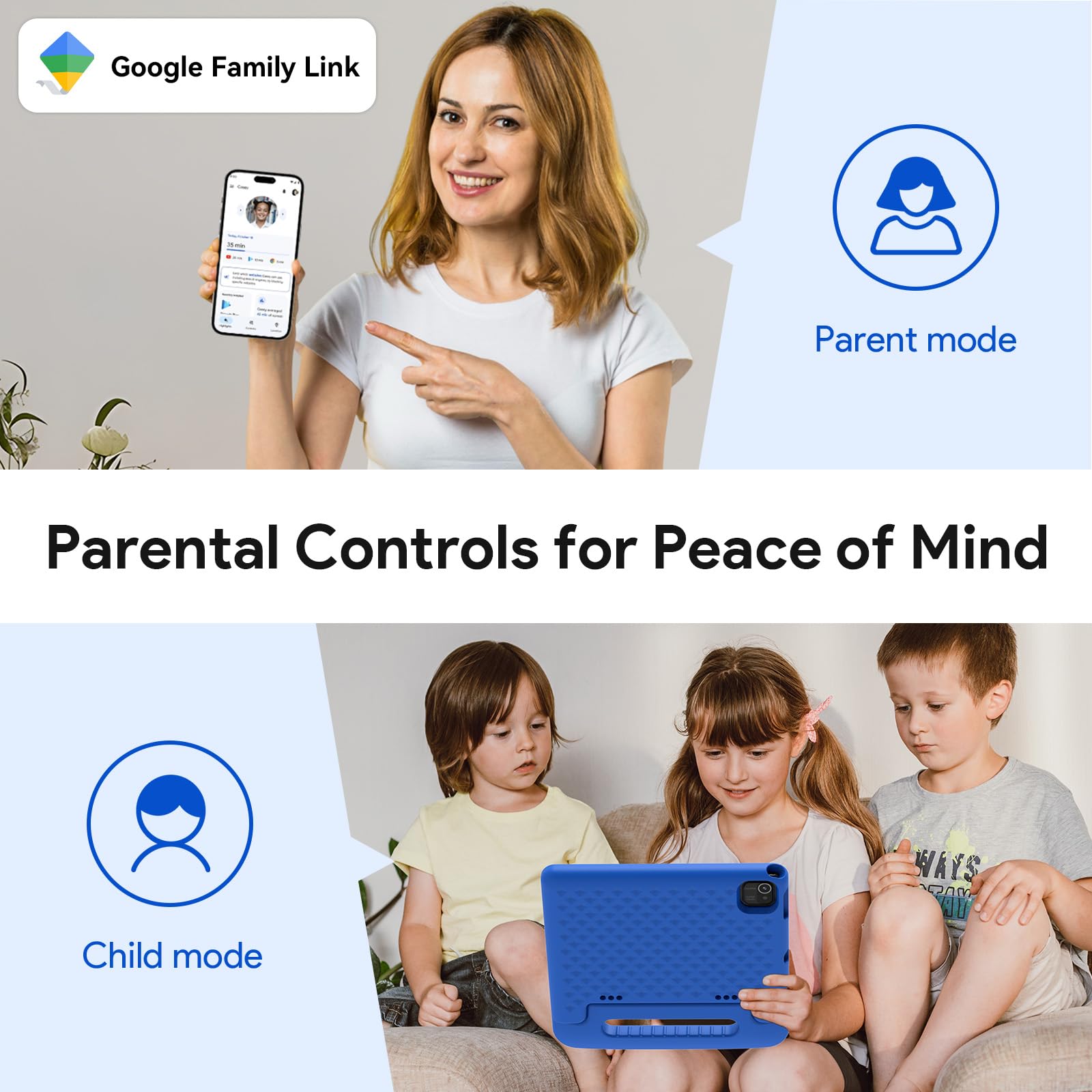 - KID-FRIENDLY AND PARENT-APPROVED: This children's tablet comes pre-installed with Google Kids Space and is designed with children in mind, including apps for reading, games, learning, and crafts. The parental control mode allows content filtering, setting educational goals, and time limits for a safer online environment.