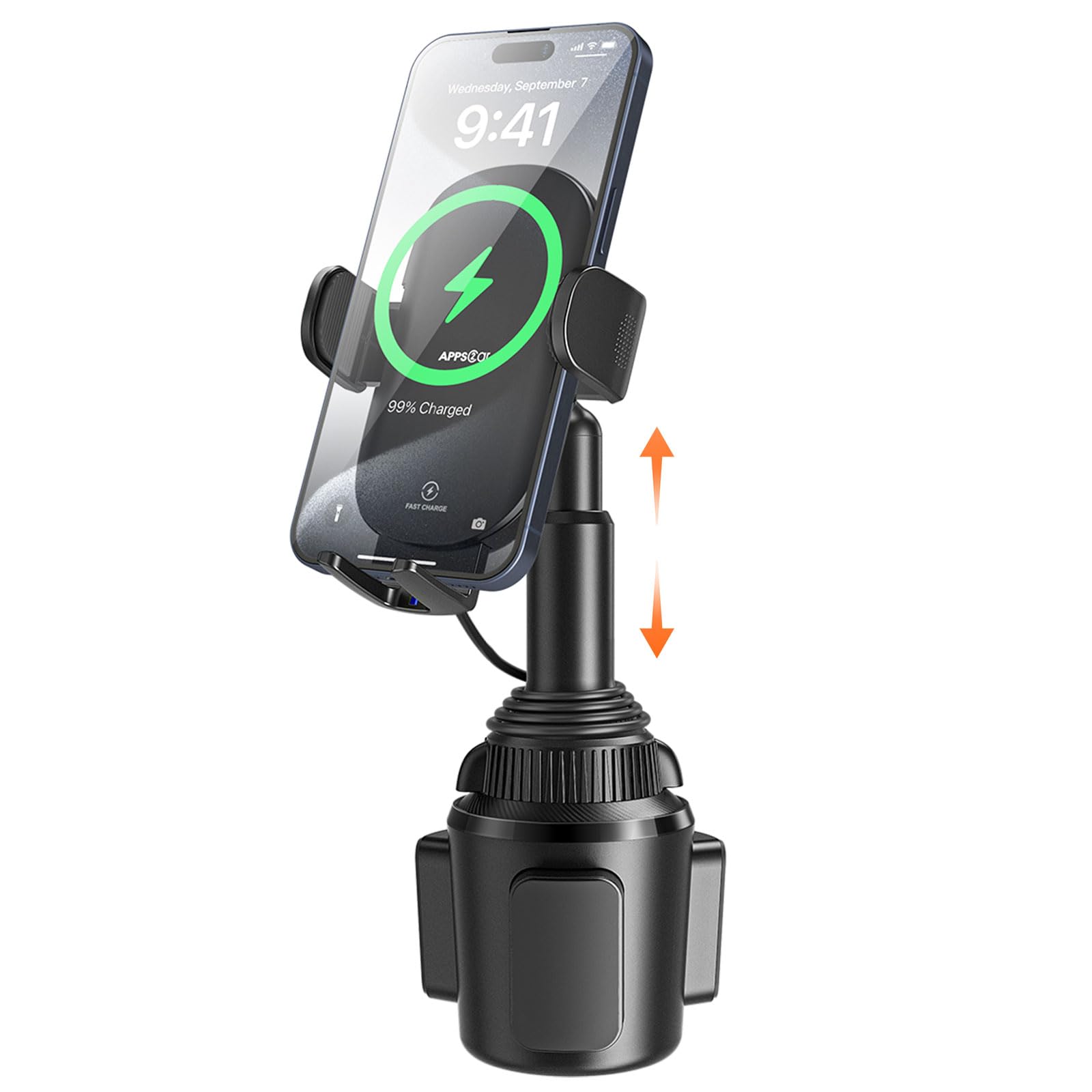 APPS2Car Solid Cup Holder Phone Mount for Car Wireless Charger 15W with Quick Extension Long Arm Fast Swivel Adjustable Height 360 Rotatable Low Profile for iPhone 15 Pro Max Plus 14 13 12 11 XS X
