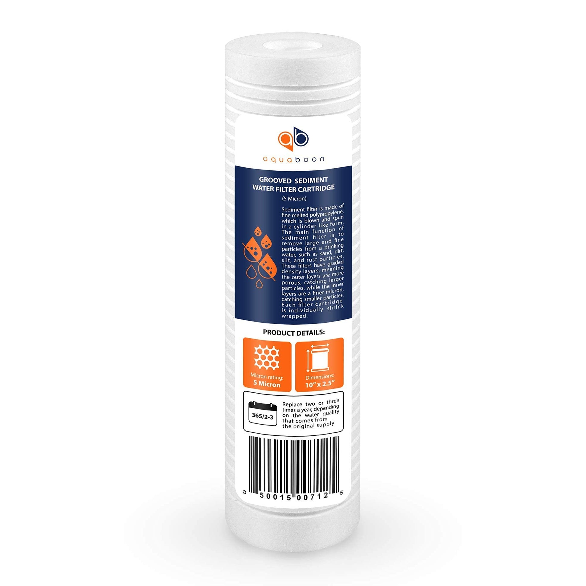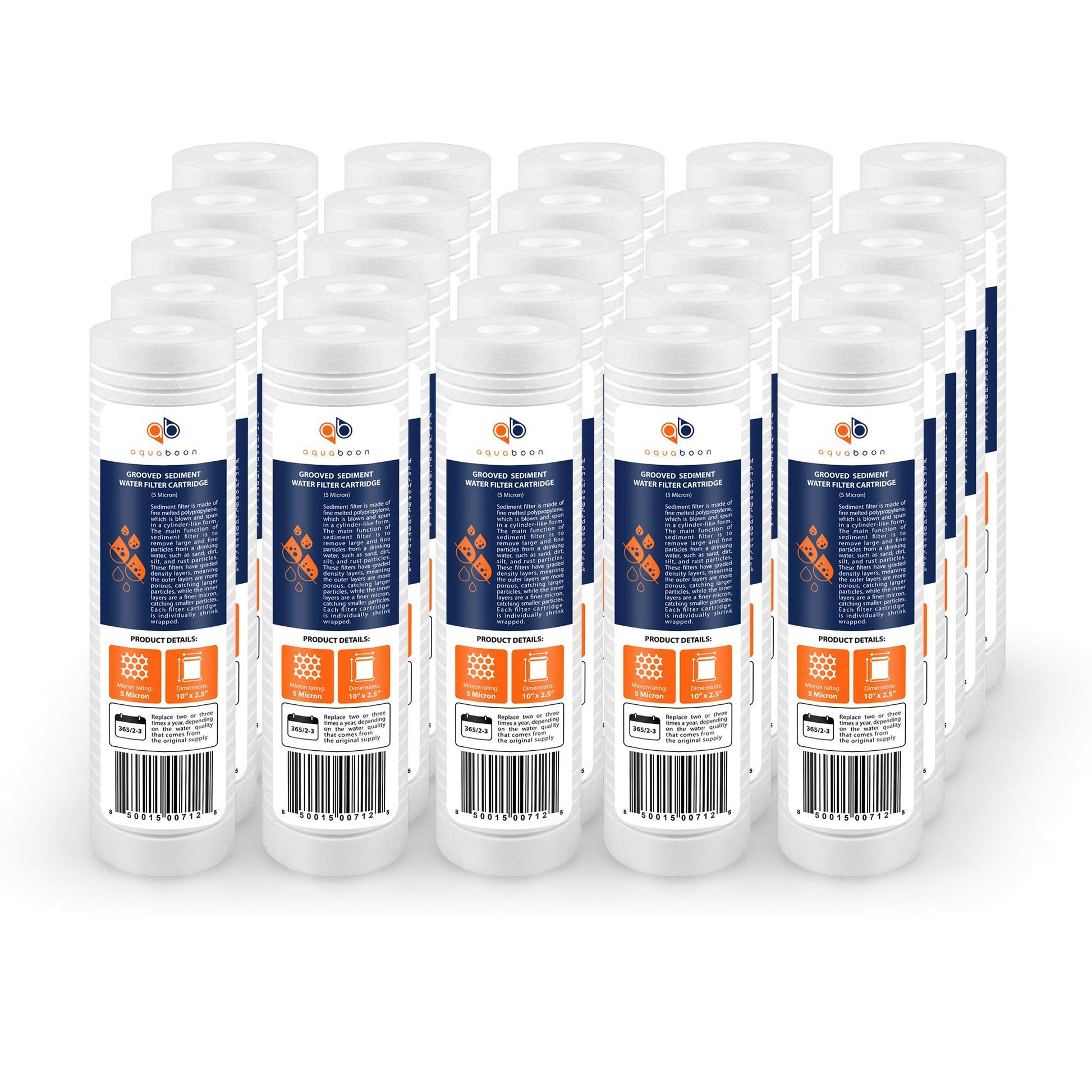 Aquaboon 5 Micron 10 x 2.5 Grooved Sediment Water Filter Replacement for Whole House Filter Cartridge Compatible with AP110, WHKF-GD05, CFS110, 25-Pack