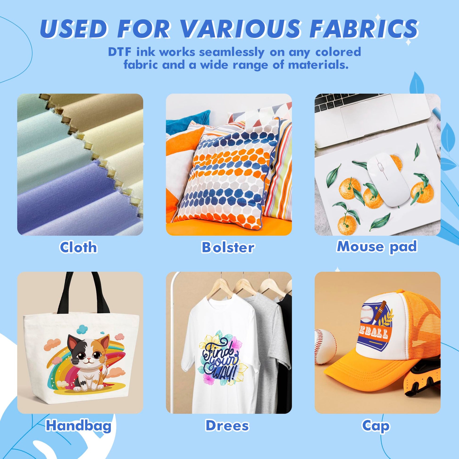 - 【DTF ink Kit】WHAT YOU GET:You will receive 6 bottles of 250ML premium quality DTF ink, which contains 2 bottles of white, black, cyan, magenta, and yellow inside. In addition, we provide 2 Gloves plus and User Manual . Hope it will be helpful for your printing
