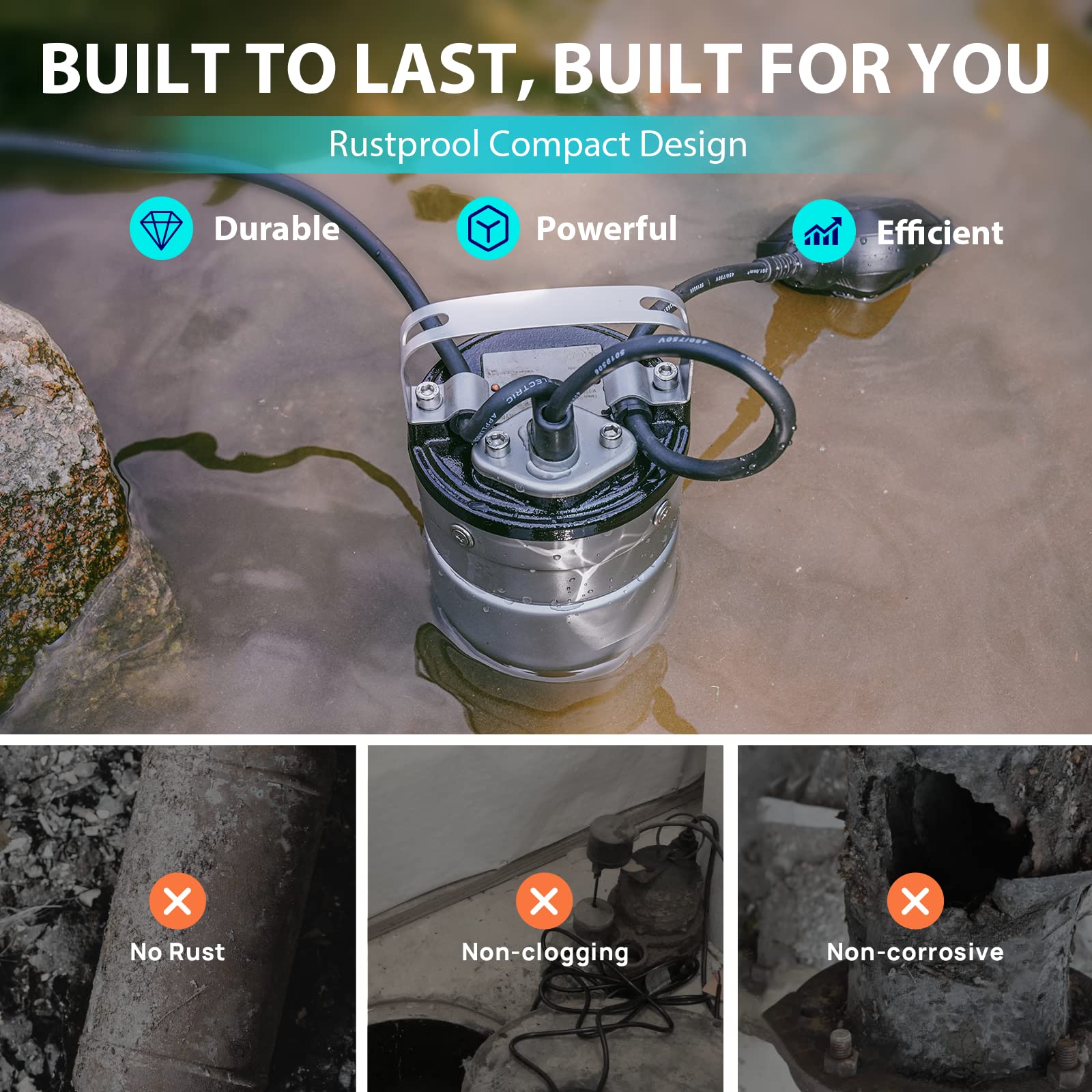 - Durable and Tough: Quality stainless steel motor housing for high corrosion and abrasion resistance. Rugged cast iron base with anti-clog impeller ensures a long service life in tough sump pump applications. Exhaust valve prevents air lock effectively for smooth flow