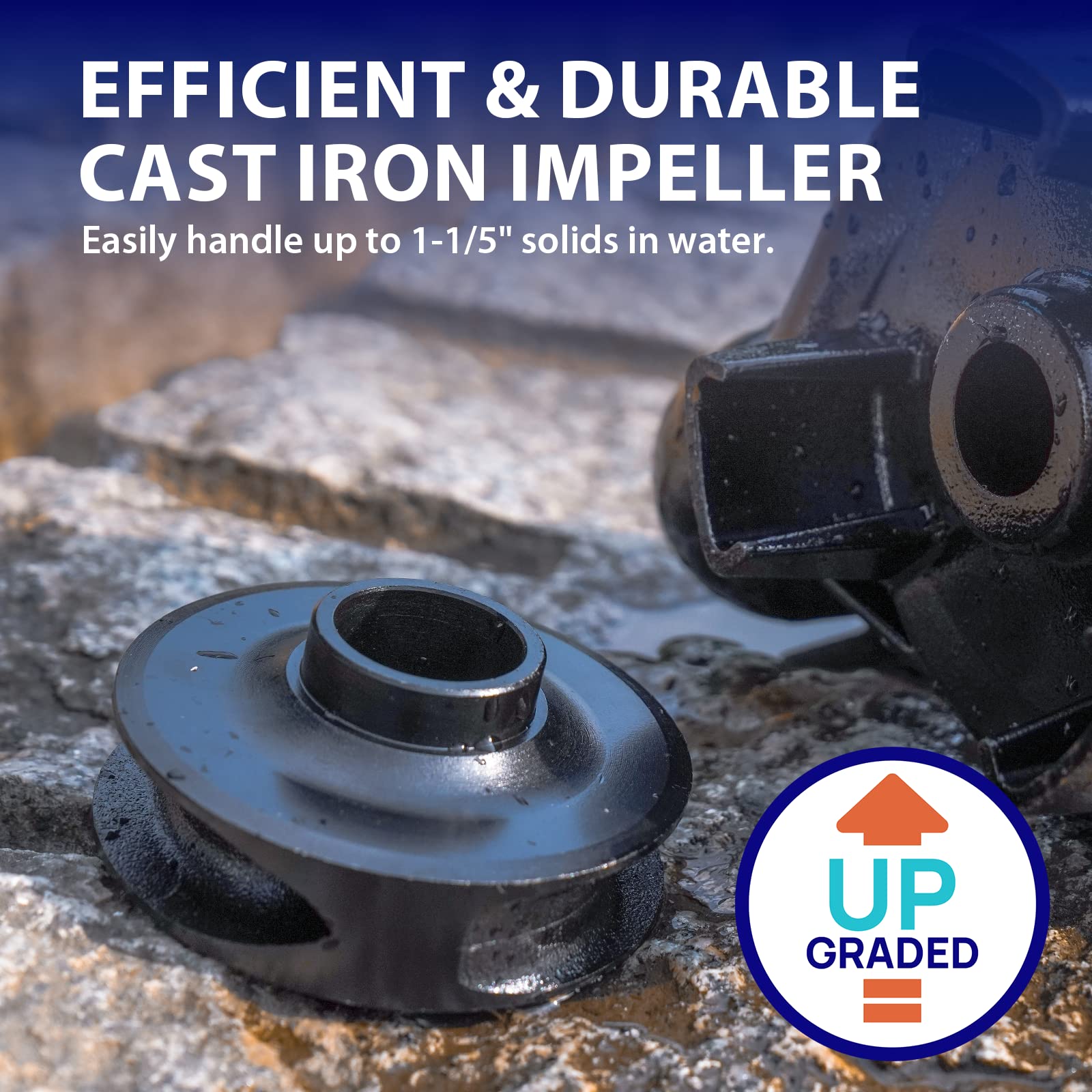 - Powerful and Reliable: 1 HP submersible sewage pump with efficient cast iron impeller ensures fast and quiet operation. It can drain water up to 5283PGH or lift water up to 56 ft, perfect for basement sewage, wastewater and rainwater removal. It can easily handle solid particles up to 1-1/5''. DO NOT use in gasoline, alcohol, or biogas-filled septic tanks