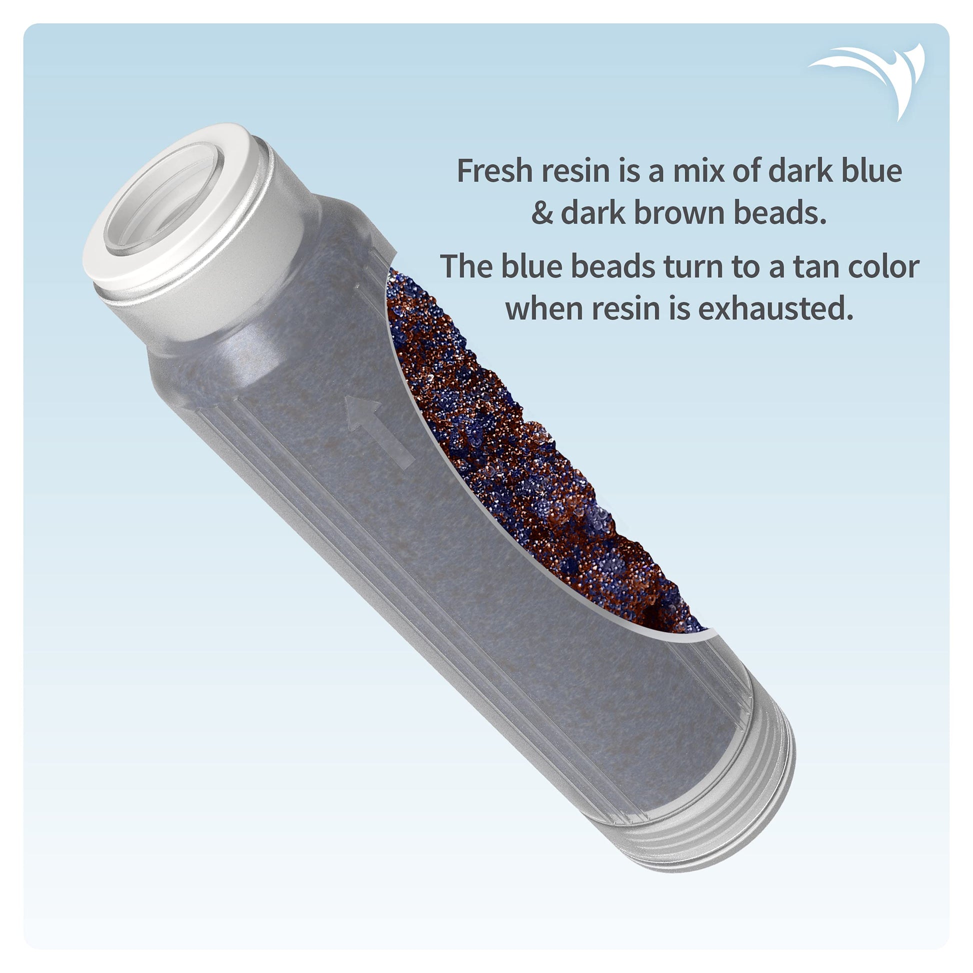 - COLOR-CHANGING DEIONIZATION RESIN – Mixed-Bed DI Filter Cartridge contains positive Cations and negative Anions. DI Resin physically changes colors from Blue to Tan when the media is exhausted.
