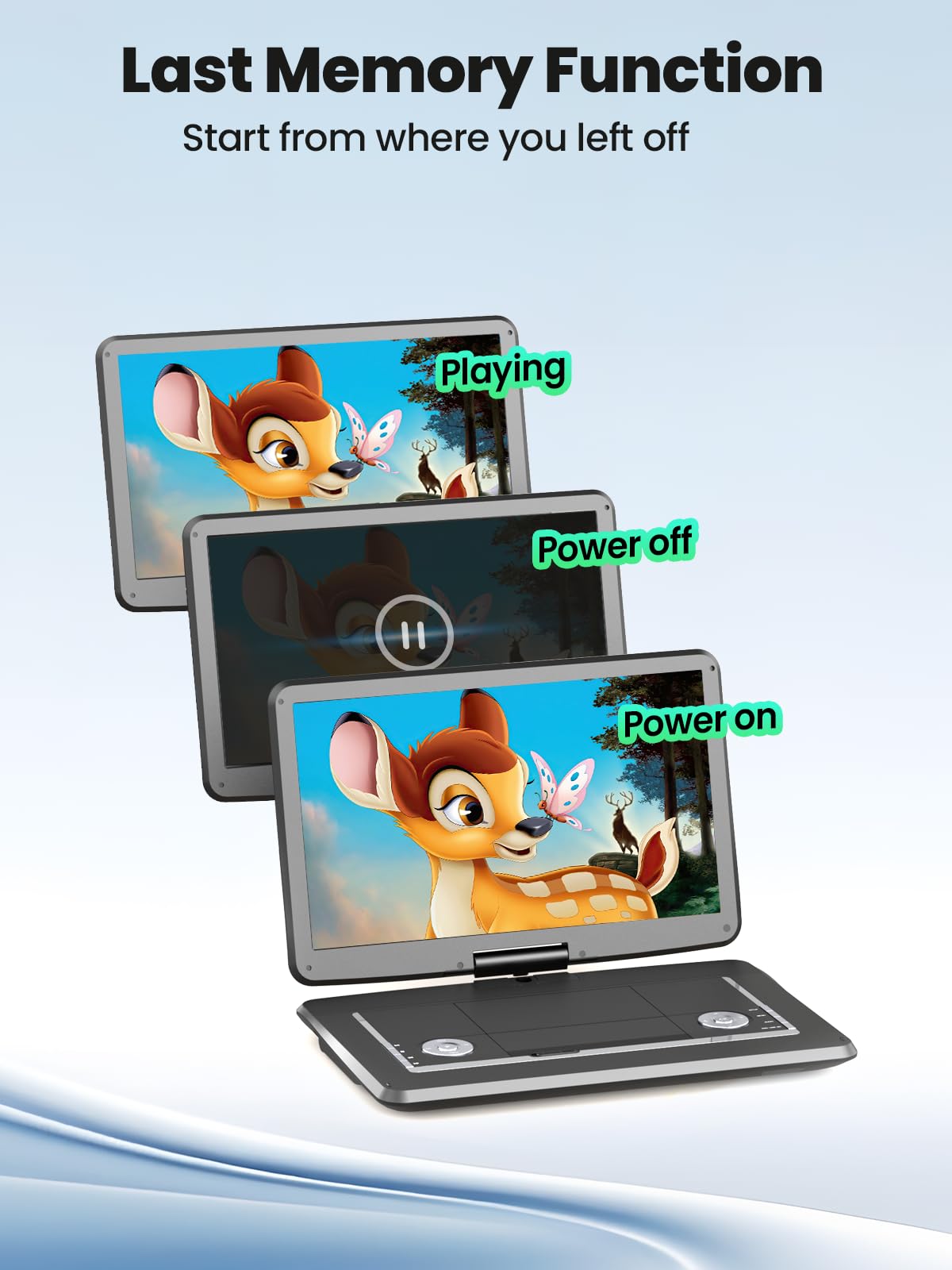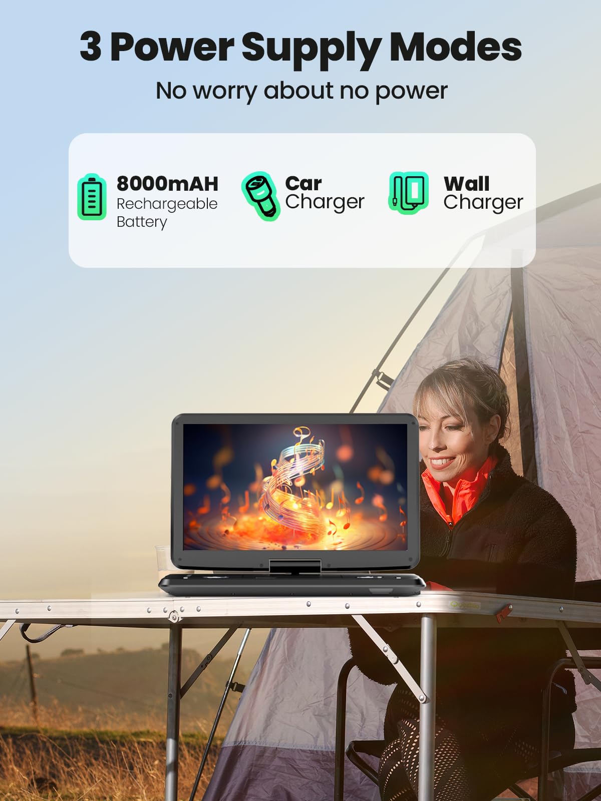 - 【3 Power Modes & Louder Speakers】Built-in 6000mAh rechargeable battery, Arafuna car DVD player can work for 4-6 hours after full charged. Equipped with car charger and AC adapter, no more worries about battery dies out.The portable DVD player for car also built-in last memory function, it will pick you up from where you left off last time.