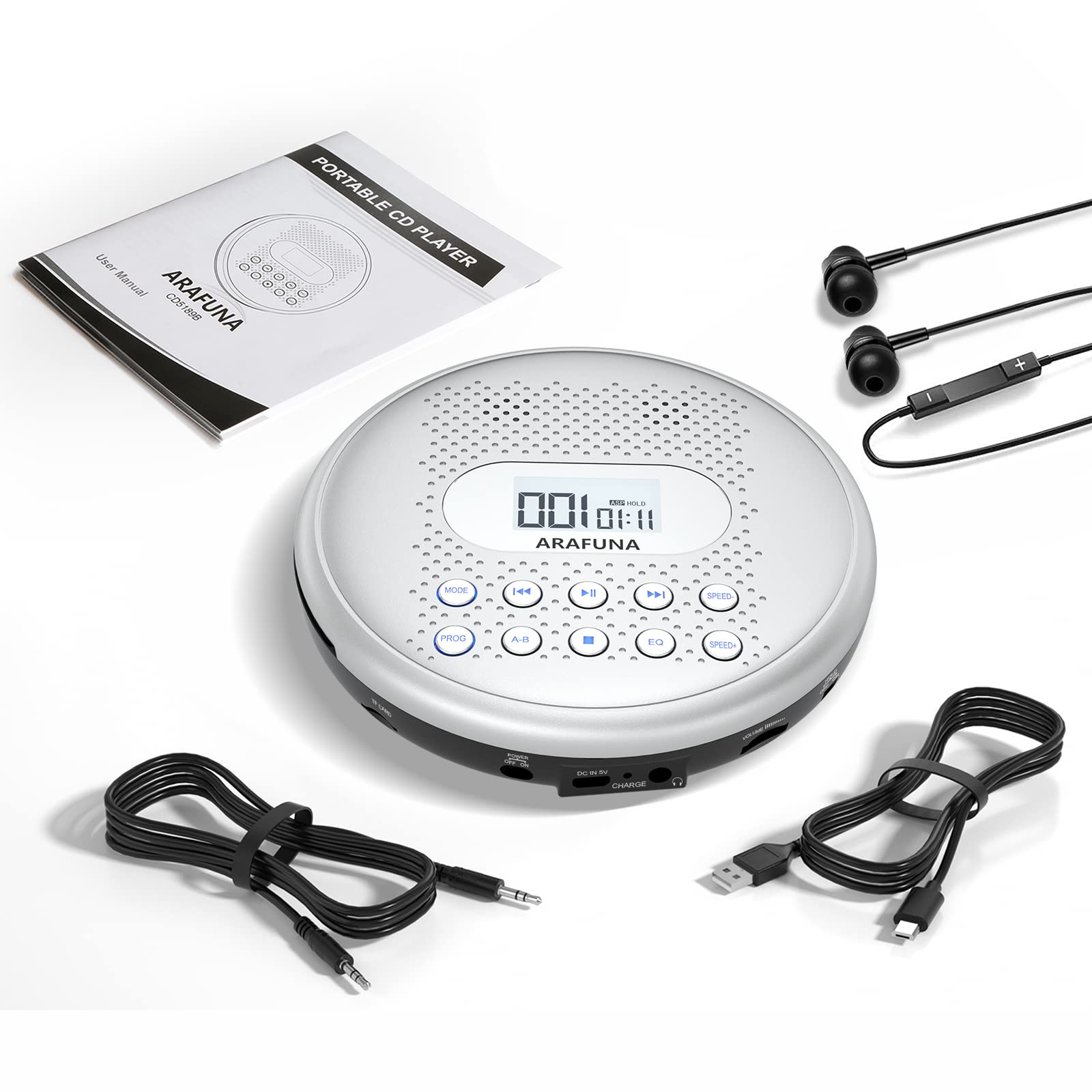 ARAFUNA CD Player Portable, Rechargeable Portable CD Players for Car with Speakers, Anti-Skip Walkman CD Player with Backlit Button, LCD Display and AUX Cable