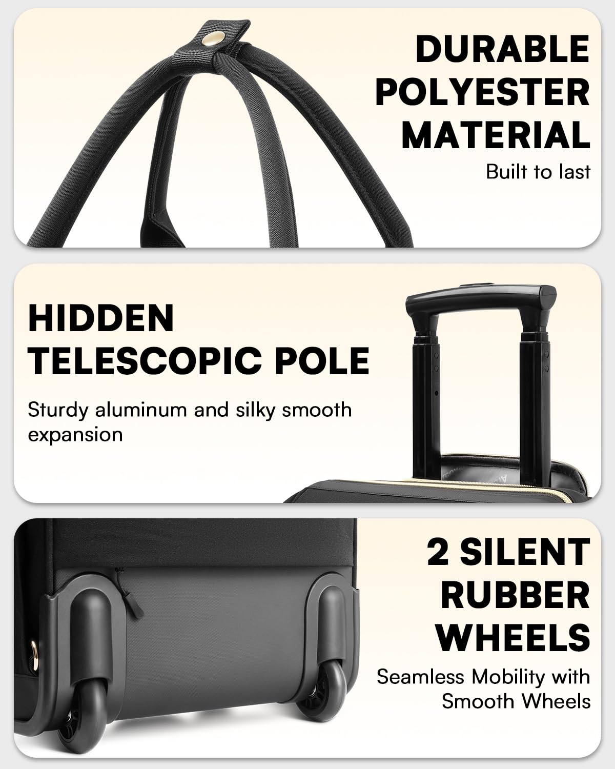 - Multifunctional Designed for college, daily commuting and business trips, this rolling backpack for women for work features a USB charging port, hidden shoulder straps, and durable, retractable aluminum handle. The backpack with wheels for women silent, wear-resistant rubber wheels ensure smooth mobility. The travel backpack with wheels can easily switch between luggage and backpack modes. When configured as a backpack, its lightweight design and soft shoulder straps provide comfortable wear.