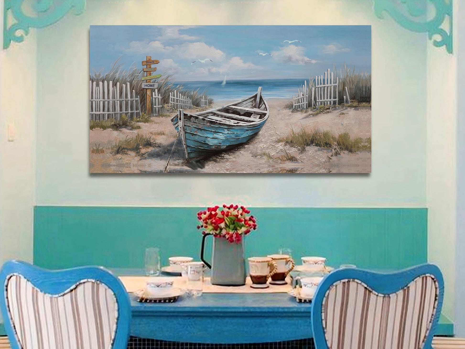 Ardemy Blue Coastal Wall Art Textured Beach Painting Turquoise Teal Sea Shore Picture Modern Boat Artwork Framed Living Room Bedroom Kitchen Bathroom Dinning Room Home Office Wall Decor Large 48"x24"