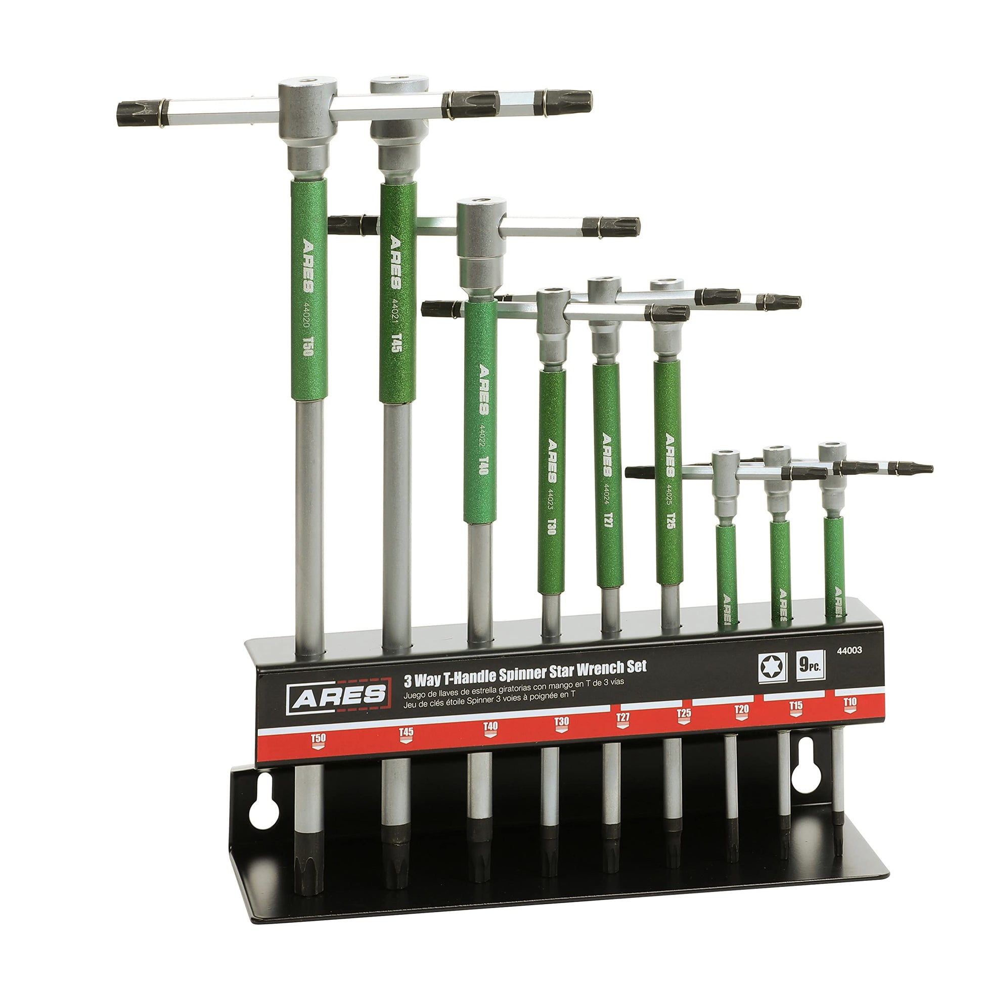 ARES 44003 – 9-Piece Torx 3-Way T-Handle Spinner Star Key Wrench Set – Sizes from T10 to T50 – Sliding Handle, Spinning Sleeve for Versatile Speed and Leverage Application – Friction Treated Tips