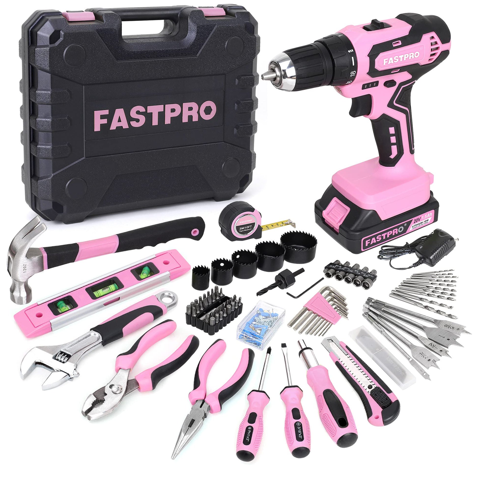 FASTPRO 177-Piece 20V Pink Cordless Lithium-ion Drill Driver and Home Tool Set, Lady's Home Repairing Tool Kit with Drill in Storage Case