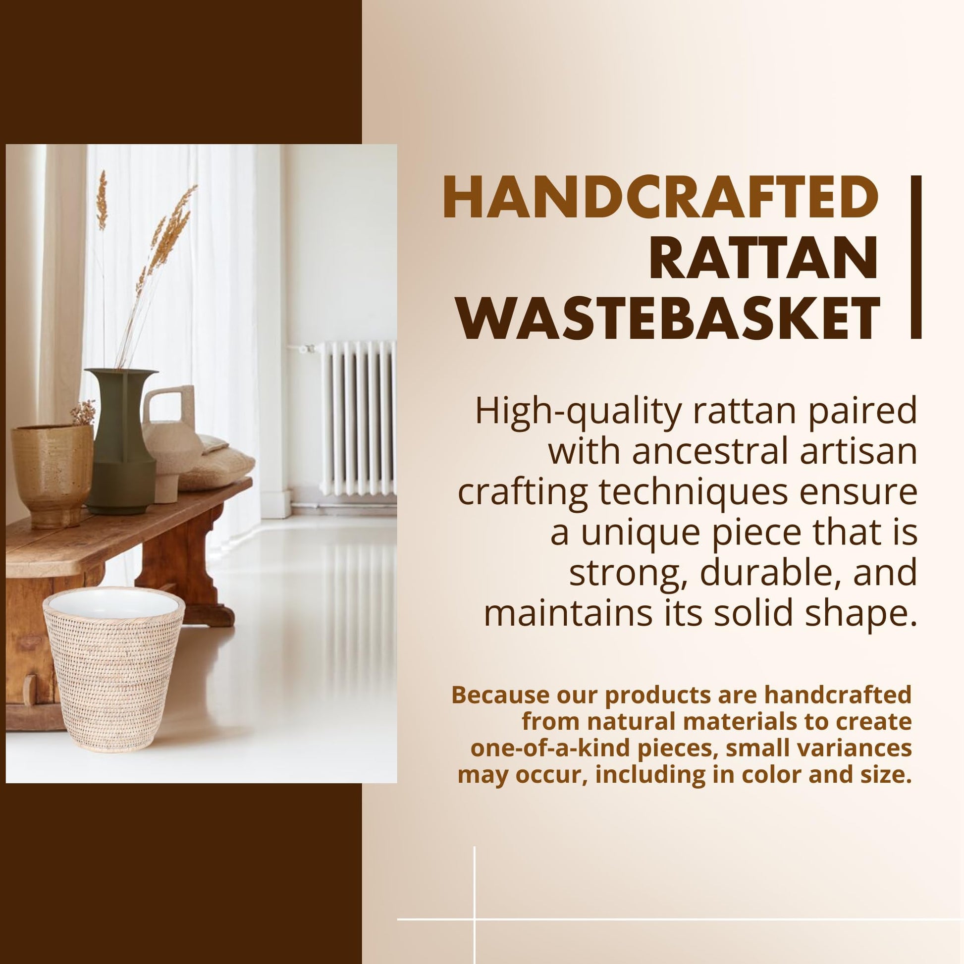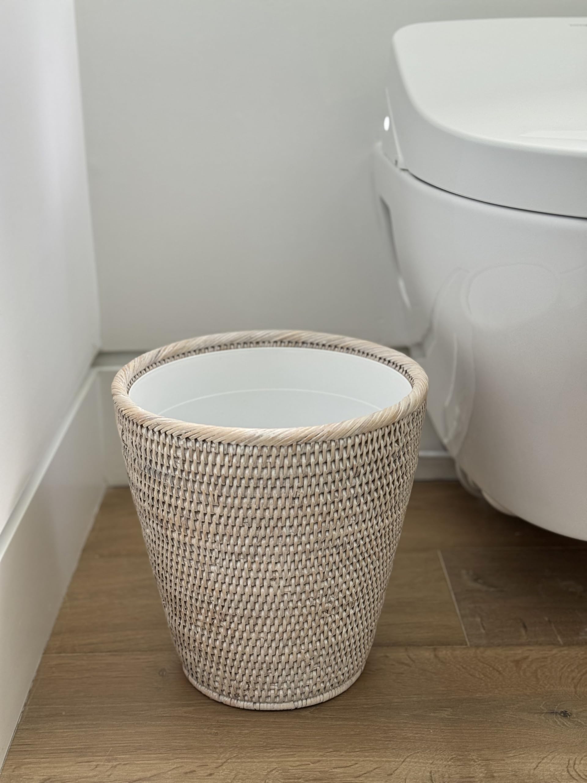 KOUBOO La Jolla Rattan Wastebasket with Plastic Insert, Handmade, Trash Can, Small Wastebasket, Bedroom, Bathroom, Vanity, RV, Dorm, White Wash