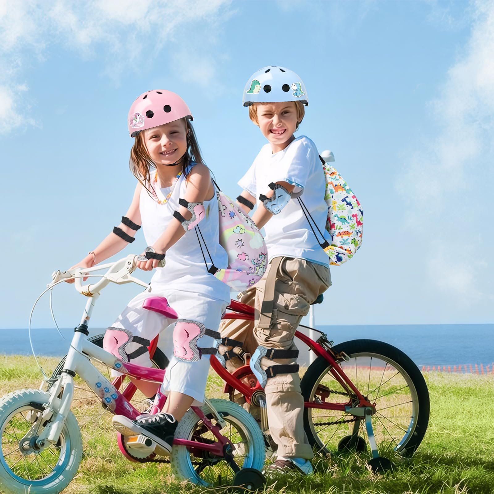 - 【7 in 1 Protective Gear with DIY Stickers】 Kids helmet and knee pads set includes 1 pink unicorn helmet, 2 knee pads, 2 elbow pads, 2 wrist pads, 100pcs unicorn stickers, 1 unicorn storage bag; You can use the stickers to DIY the helmet with your child to make it look unique. Our protective kit includes everything all kids' need for protection and to wear the pads. It is easy to carry and provides comprehensive protection for kids during outdoor activities.
