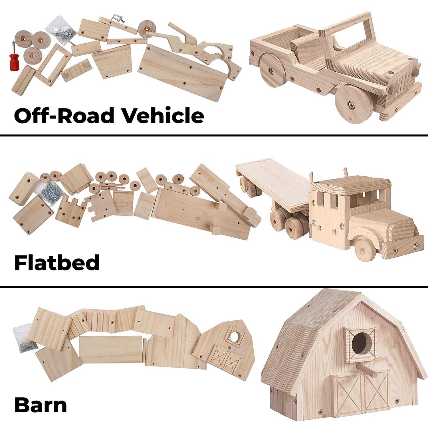 Kraftic Woodworking Building Kit for Kids and Adults, Set of 3 Educational DIY Carpentry Construction Wood Model Kit Toy Projects for Boys and Girls - Off-Road Vehicle, Flatbed Truck, Barn Birdhouse