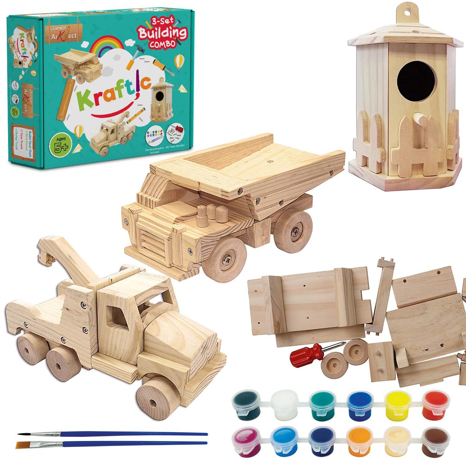 Kraftic Woodworking Building Kit for Kids and Adults, with 3 Educational DIY Carpentry Construction Wood Model Kit Toy Projects for Boys and Girls - Tow Truck, Birdhouse and Dump Truck