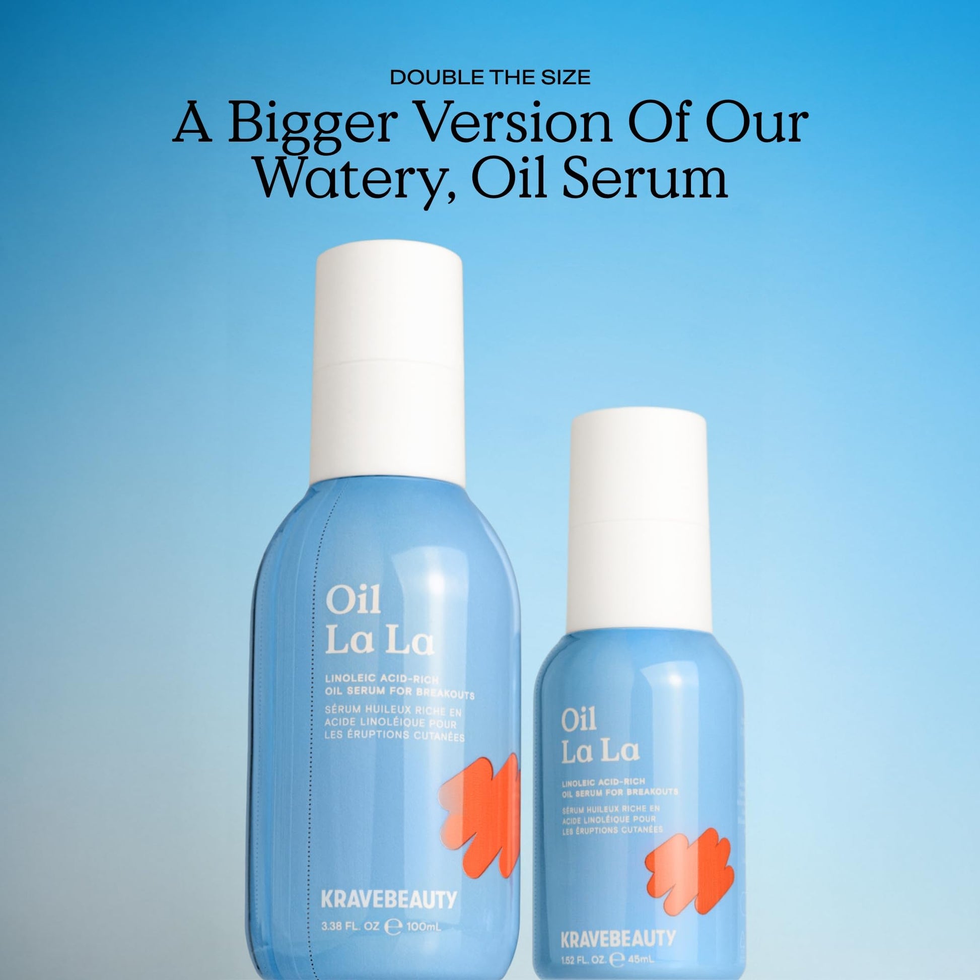 - BREAKOUT SERUM - A bigger version of our watery, oil serum that supports healthy sebum composition to soothe and prevent current and future breakouts. With the same blend of peptides and linoleic-acid rich oils, Jumbo Oil La La offers a skin-deep solution to soothe and balance your lipid profile and gently relieve congestion. Stay loyal to the oil and see clearer skin and days ahead!