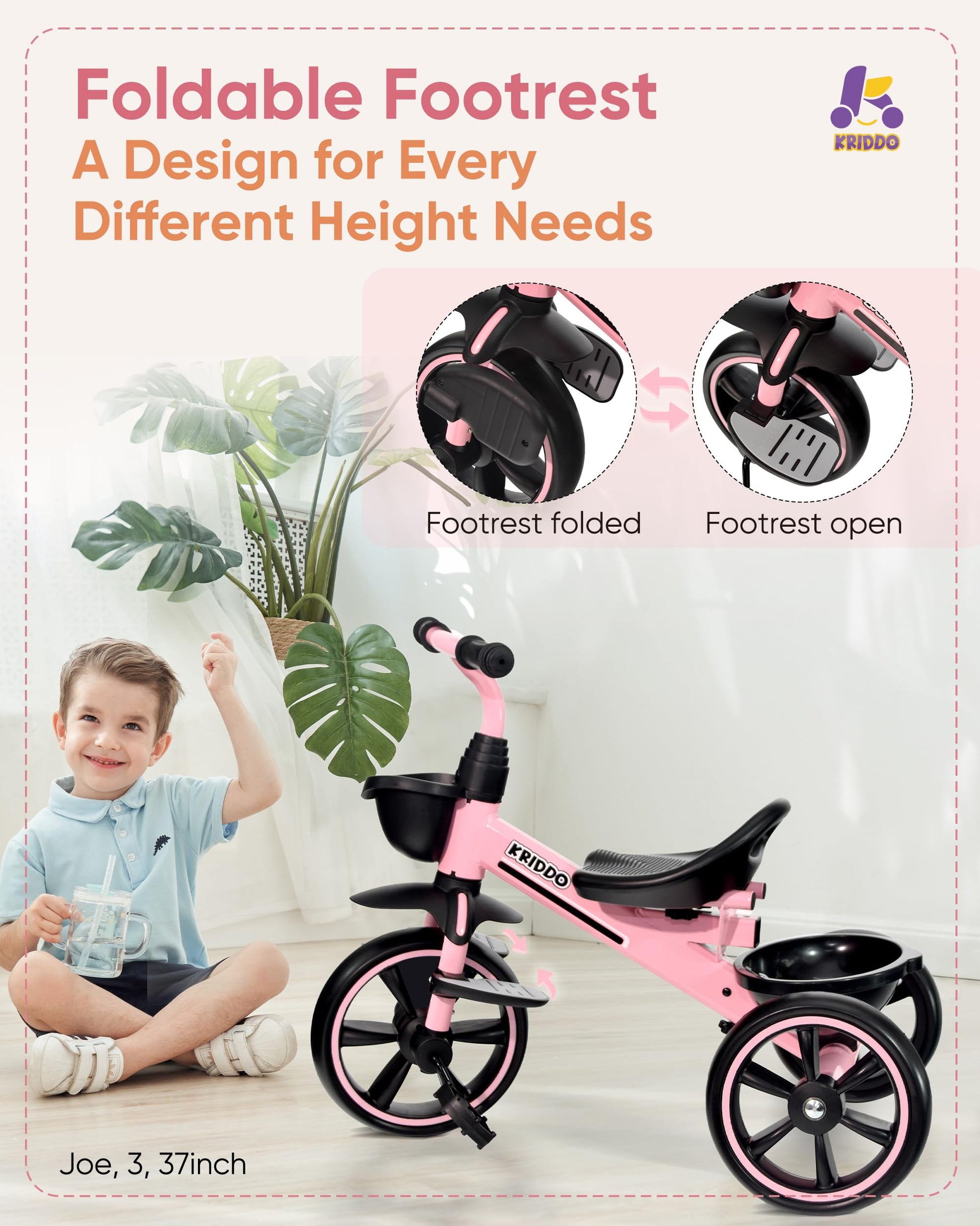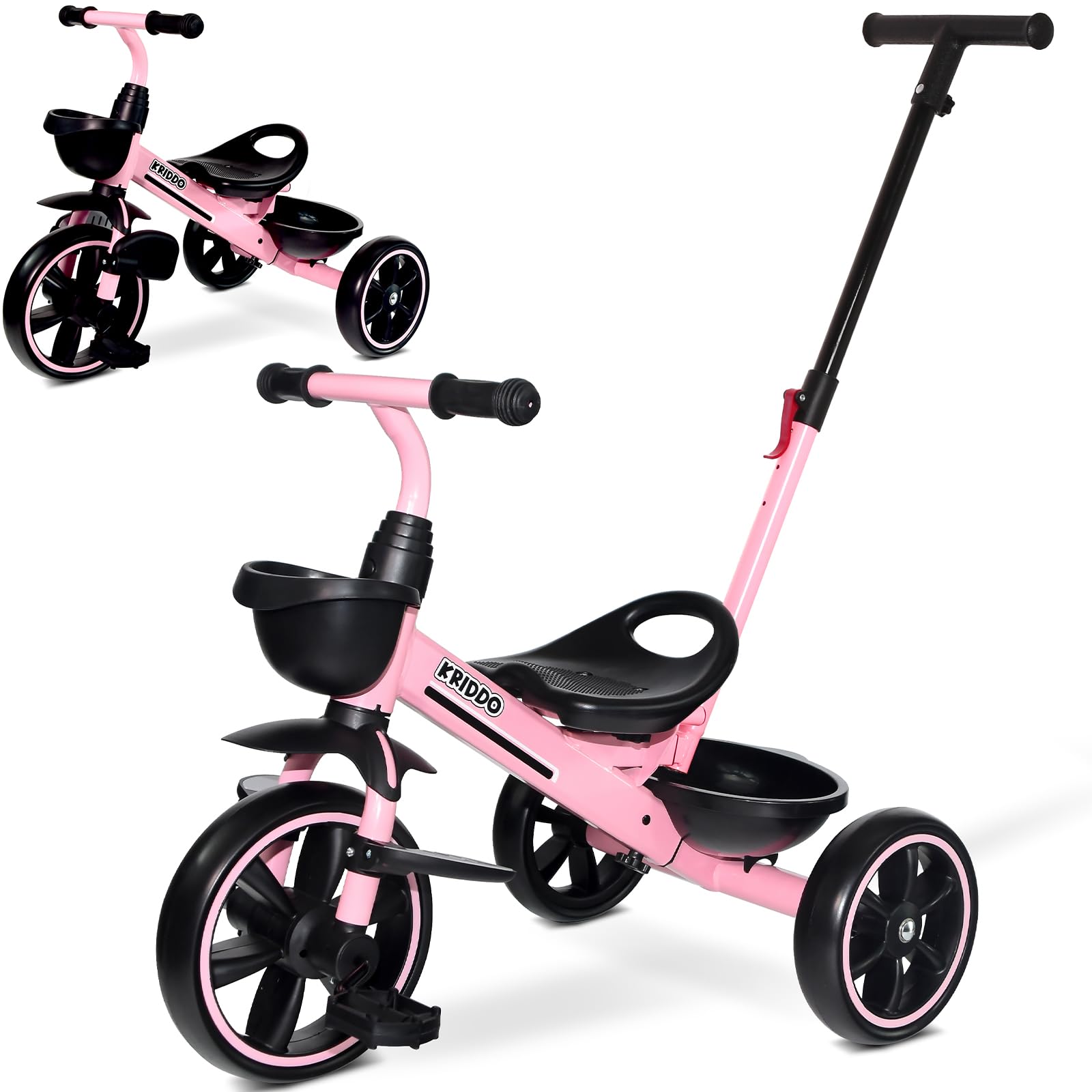 KRIDDO 2-in-1 Toddler Tricycle for Ages 18 Months to 5 Years Old - Extended Push Handle for Effortless Push, Gift Trike for Toddler 3 to 5 Year, Kids Tricycle with Foldable Front Footrest, Pink