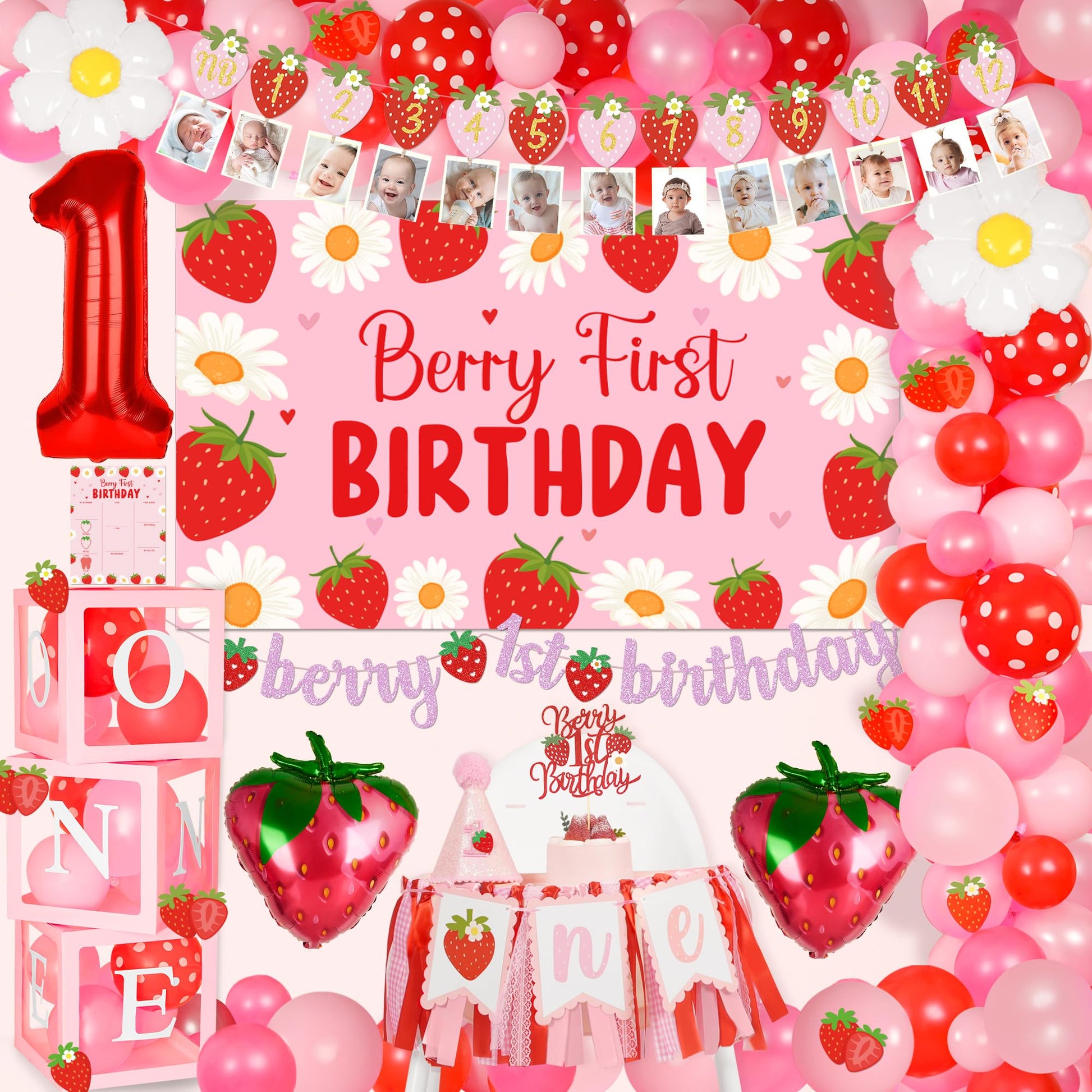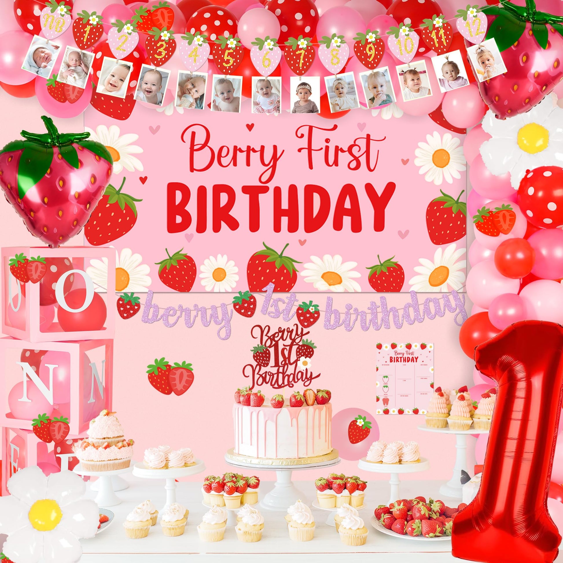 - Strawberry Birthday Theme Design: This set of strawberry birthday party supplies is perfect for you. Our decorations are adorable with strawberry elements. Our backdrops, photo banners, high chair banners, birthday hair and insert sign inserts are all printed with strawberry and floral designs and text.Celebrate your baby girl's first birthday with this strawberry first birthday party supplies set that she will love
