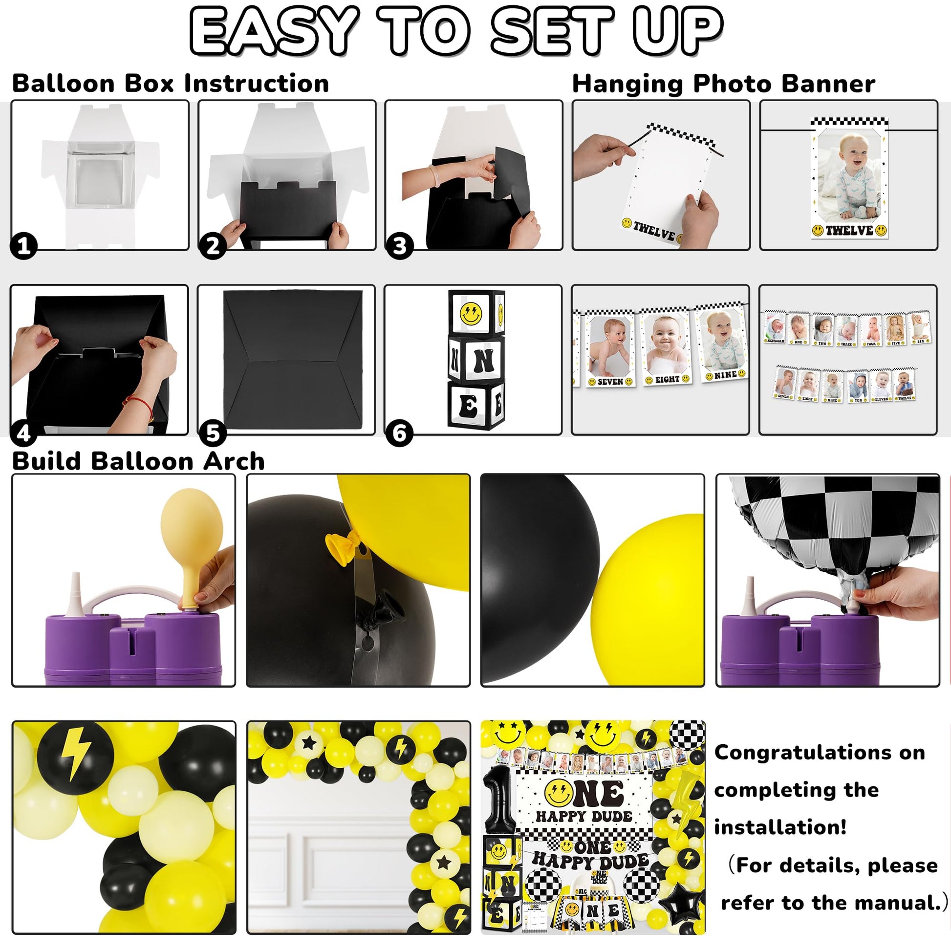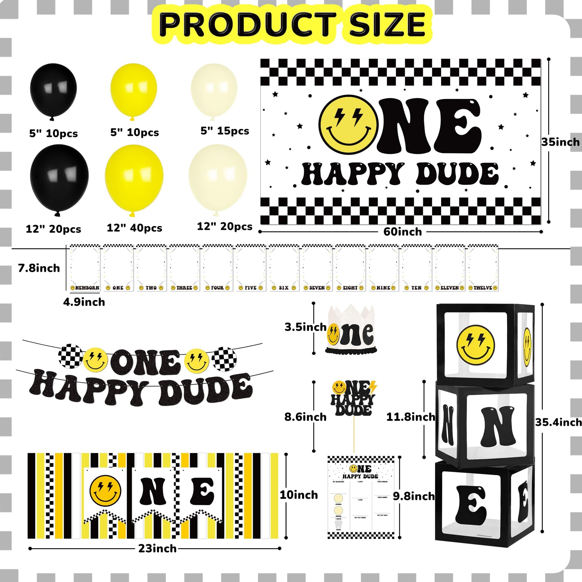 - All in One 1st Birthday Party: You will get a complete set of one happy dude 1st Birthday Party Supplies, including: 3 balloon boxes (with “one” letters), backdrop, high chair banner, cake topper, crown, milestone poster, newborn to 12 months photo banner, one happy dude banner, 105 latex balloons (2 sizes, 5“+12”), 8 foil balloons (1 number, checkerboard, star, lightning bolt, smiley face balloons), Perfect build balloon arch kit to organize unforgettable 1st one happy dude birthday party for your baby