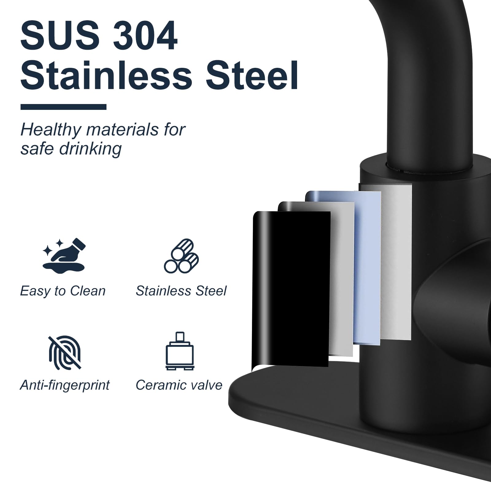 - Premium Quality: The matte black bathroom faucets has exquisite special solid stainless steel body design, rust-resistant finishing. The surface transition design prevent dirty and water stain from sticking to faucet surface.