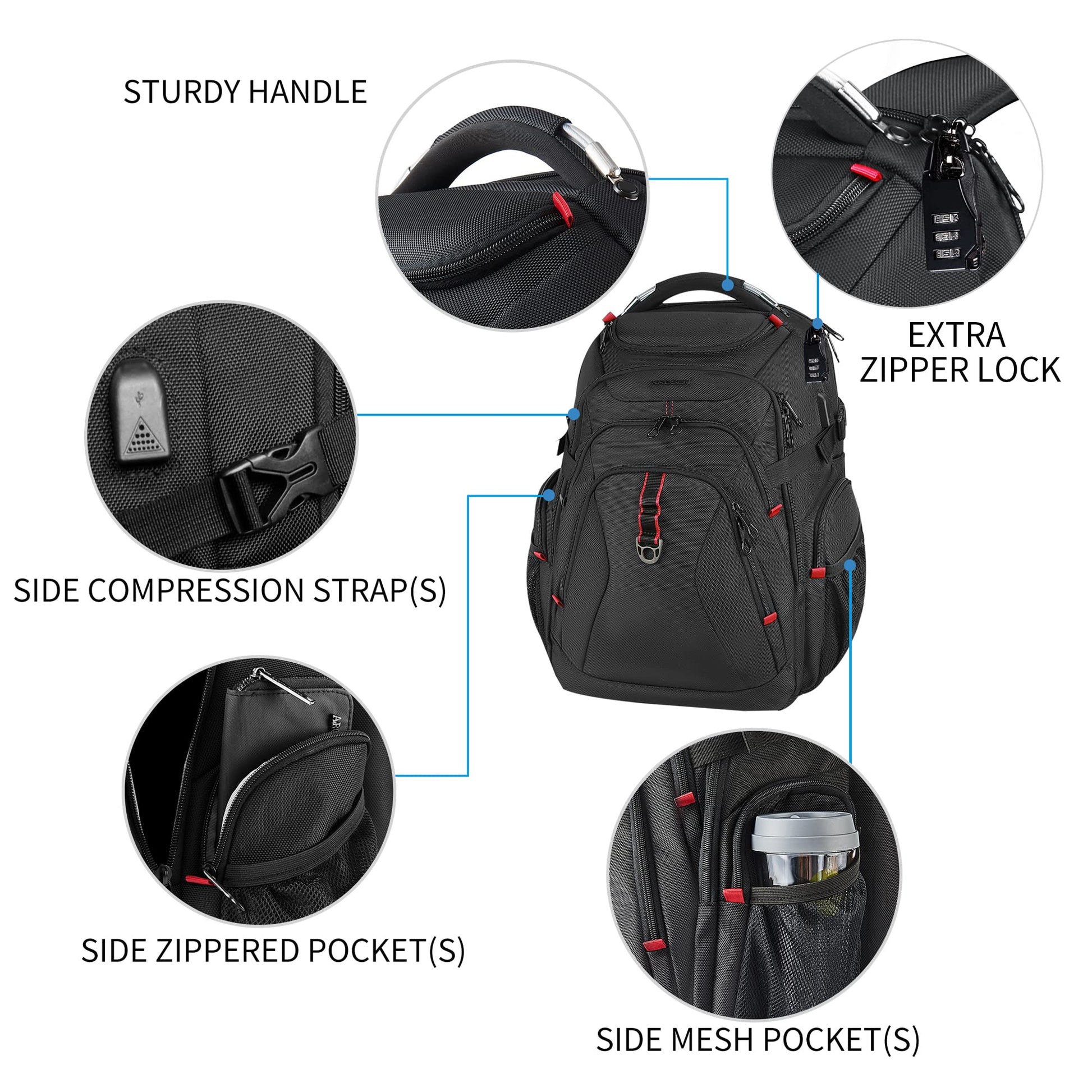 - MULTI-FUNCTIONAL COMPARTMENT: Our large travel backpack with separated compartments and pockets which can provide roomy space for your computer, iPad, power bank, A4 files, wallet, cards, clothes and more your items. A zippered pocket and a mesh one at each side can hold your umbrella, water bottle, etc. A sunglass hard shell zone is designed on the top which is convenient and safe for you to put your sunglass, cell phone etc