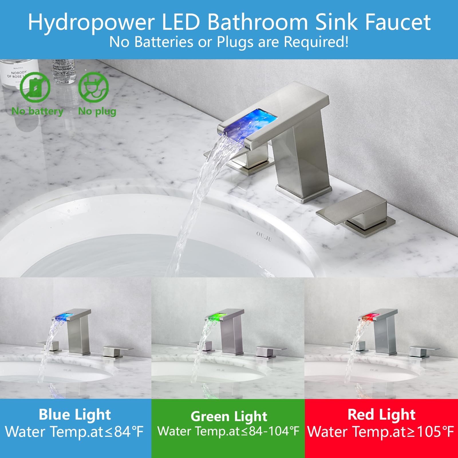 - 【Hydropower Faucet - LED 3 Color Changing】3 colors of bathroom sink faucet change according to water temperature:When the water temperature is less than or equal to 80°F (26.7°C), the light color is blue. When the water temperature is between 80 ° C (26.7°C) and 110°F (43.3°C), the light color is green. When the water temperature is greater than 110°F (43.3°C), the light color is red. It provides additional relaxation and visual pleasure while avoiding burns.