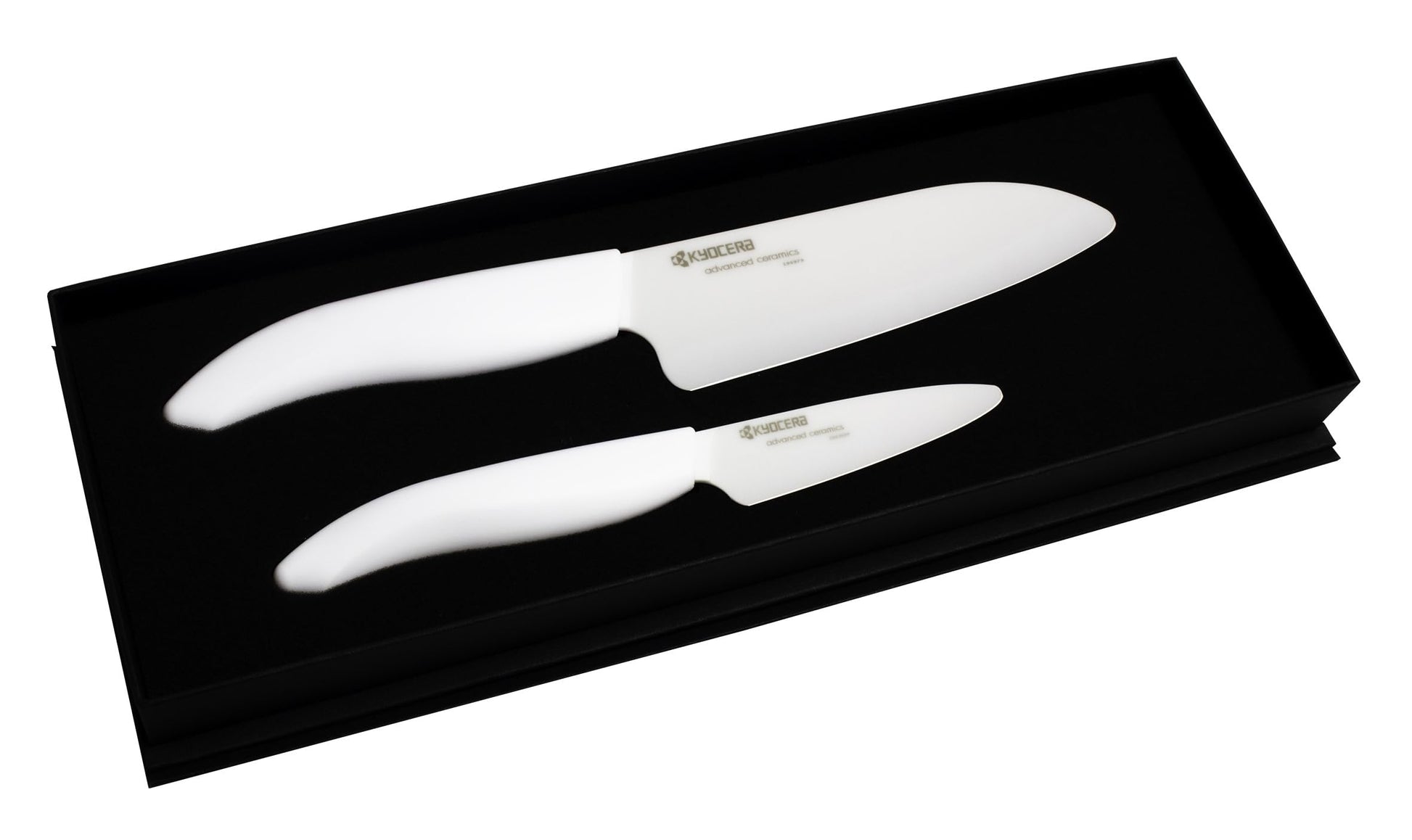Details: The Kyocera revolution series 2-Piece gift set includes a 5. 5-Inch Santoku knife and a 3-Inch Paring knife; essential tools for the home cook looking to prepare fresh meals with ease. From Kyocera's most popular line of advanced ceramic knives, designed with a comfortable, ergonomic handle for precise control. The ceramic blades are made from a proprietary zirconia material produced in Japan and stays razor sharp at least 10 times longer than traditional knives, making them ideal for everyday use. The perfect choice for slicing fruits, vegetables and boneless meats. Not intended for frozen or hard foods. Kyocera advanced ceramic cutlery and kitchen tools are fully warranted to be free of defects in material and craftsmanship.