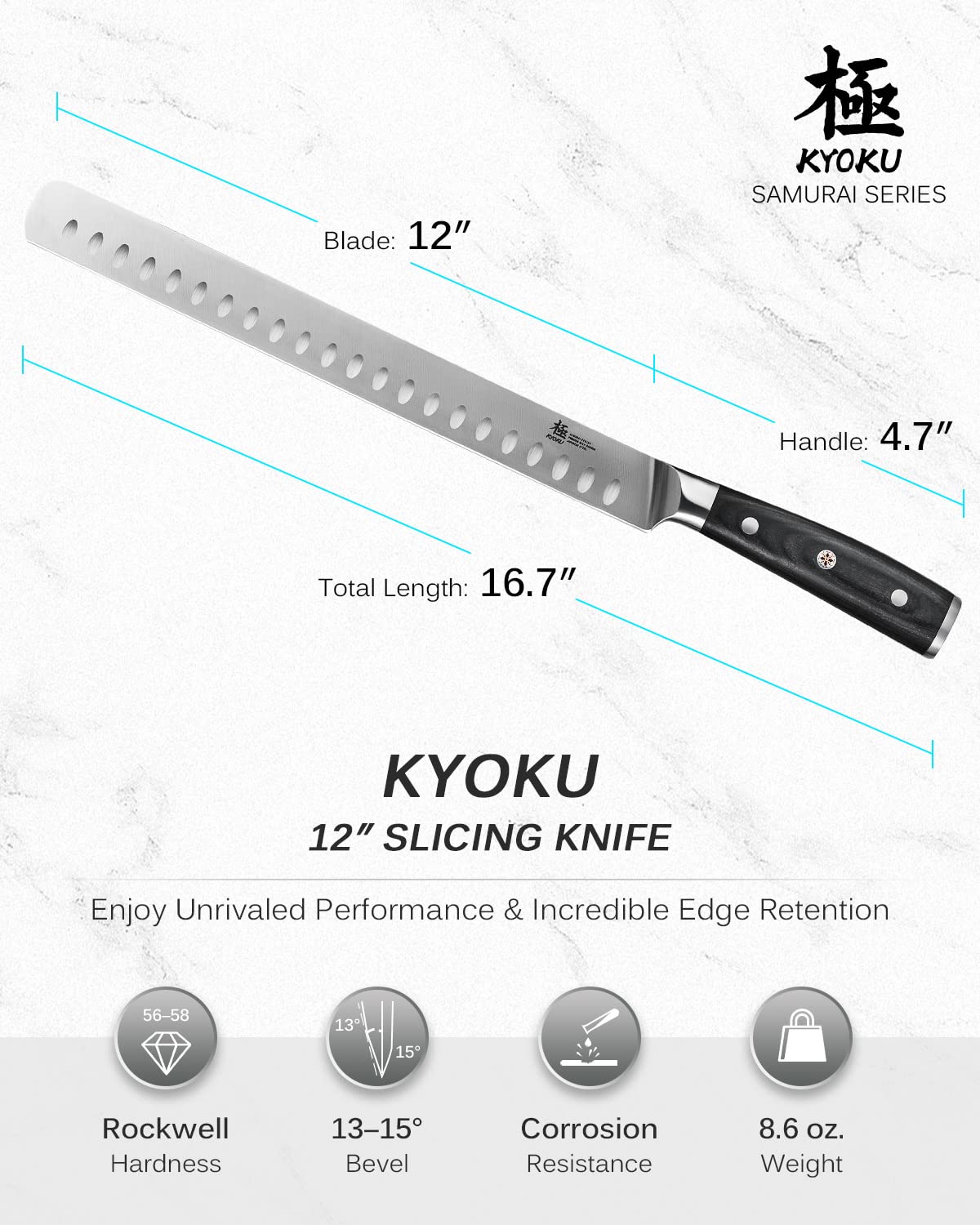 - 12" Carving Knife: Kyoku's 12" meat slicing knife from Samurai Series is expertly crafted with Japanese high carbon steel for superior performance and durability. With its long and narrow blade, this knife is ideal for slicing meat, vegetables, and fruits into thin pieces effortlessly.