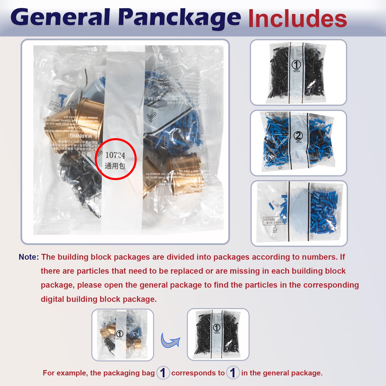 - Note: The building block packages are divided into packages according to numbers. If there are particles that need to be replaced or are missing in each building block package, please open the general package to find the particles in the corresponding digital building block package. For example, the packaging bag ① corresponds to ① in the general package.