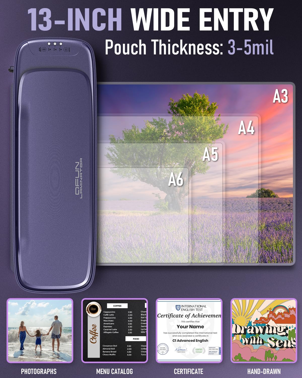 - 2024 New Upgraded 9-in-1 Lamination Machine: Crafted with high-molecular construction materials for unparalleled durability, our QFUN laminator comes in cool colors that make it a stylish addition to your studio. Dive into endless possibilities with our thermal laminator, which includes a built-in 1*paper cutter, 1*corner rounder, 1*hole punch, 3*binder rings, and 30 sheets of 3 mil laminating paper (including 3A3, 9A4, 9A5, 9A6). Everything you need to kickstart your laminating journey is right here