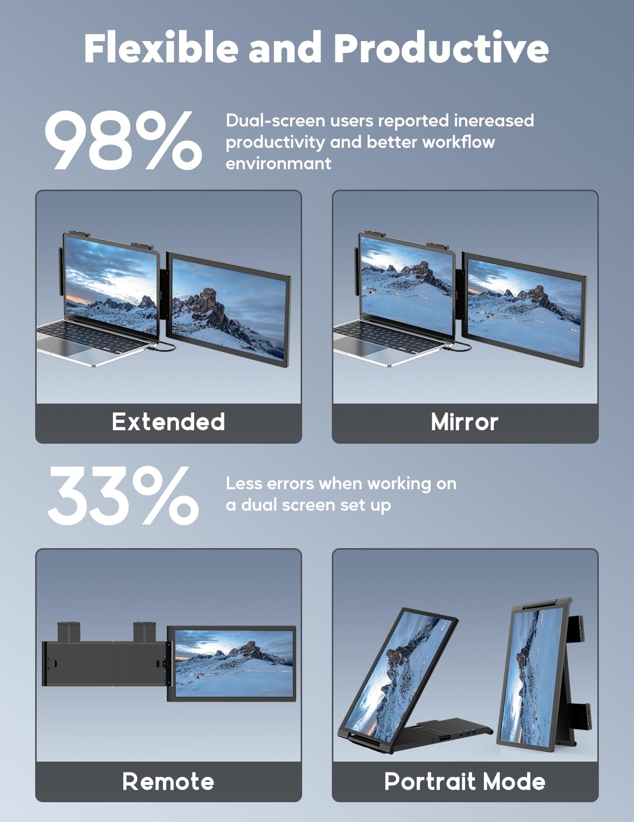 - 【Raise Productivity by 200%】 - With support for both extension and mirroring modes, the HONGO laptop screen extender enables simultaneous multi-screen or independent display, making multitasking and remote working a breeze. HONGO travel monitor for laptop screen extender supports you to open multiple windows at the same time, work, video conference, watch movies, or play games on different screens by not having to switch back and forth on a single laptop screen continuously, increase your efficient by up to 200%. Perfect for people who work on the go,remote workers, watch a movie,IT professionals, Players, Stock traders, Programmers, game players, etc!