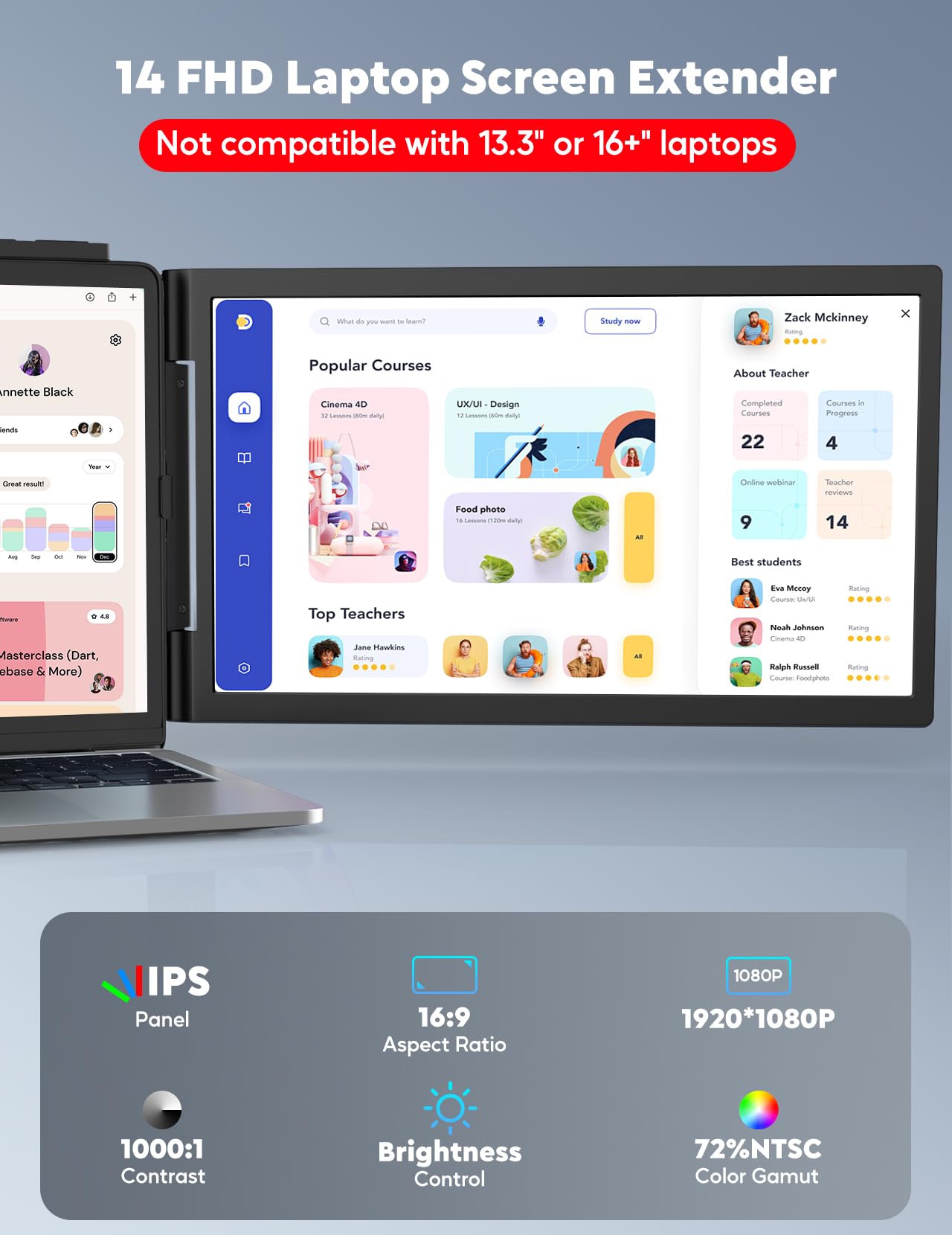 Laptop Screen Extender,14" FHD 1080P IPS Dual Screen,Attachment Screen Extended Extra Screen, Portable Monitor for Laptops 14-16" with USB-C/HDMI Port, Plug n Play for Windows/Mac/Android/Switch/PS5