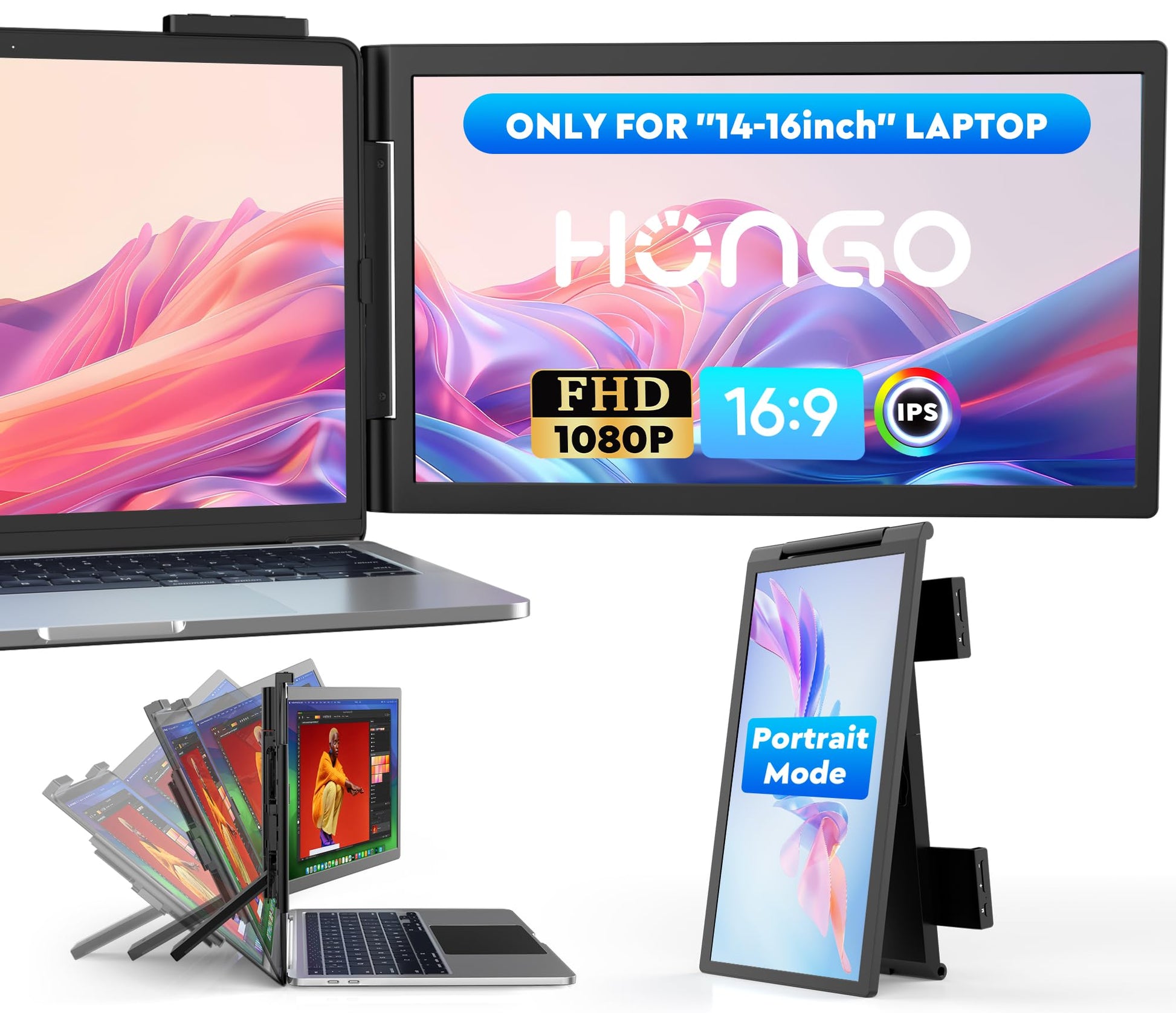 - 【Outstanding Visual Quality】 - The HONGO laptop screen extender boasts a 14-inch FHD IPS display with enhanced brightness up to 300 nits, paired with a 1920x1080P resolution and 1000:1 contrast ratio for superior image clarity. Also users can customize their screen display to suit their preferences, creating a personalized and immersive visual experience. It auto-adjusts between landscape and portrait with a quick OSD setting change, providing an ideal display for any task.Portable and compact, it offers a wide tilt range, doubles as a stand, and folds neatly to fit into slim bags, making it perfect for travel. Boost productivity and enjoy a vivid viewing experience on the go.