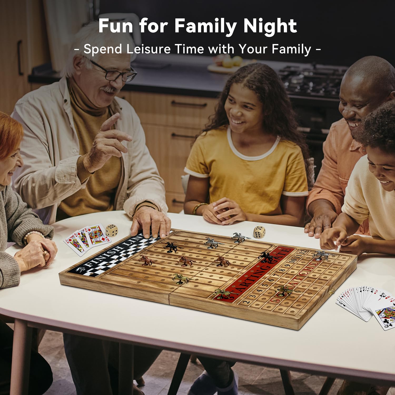 Large 23 inches Horse Racing Board Game with 11 Luxury Metal Horses, Foldable Wood Horse Race Board Game with 2 Sets of Dice, 2 Boxes of Cards for Parties and Gambling