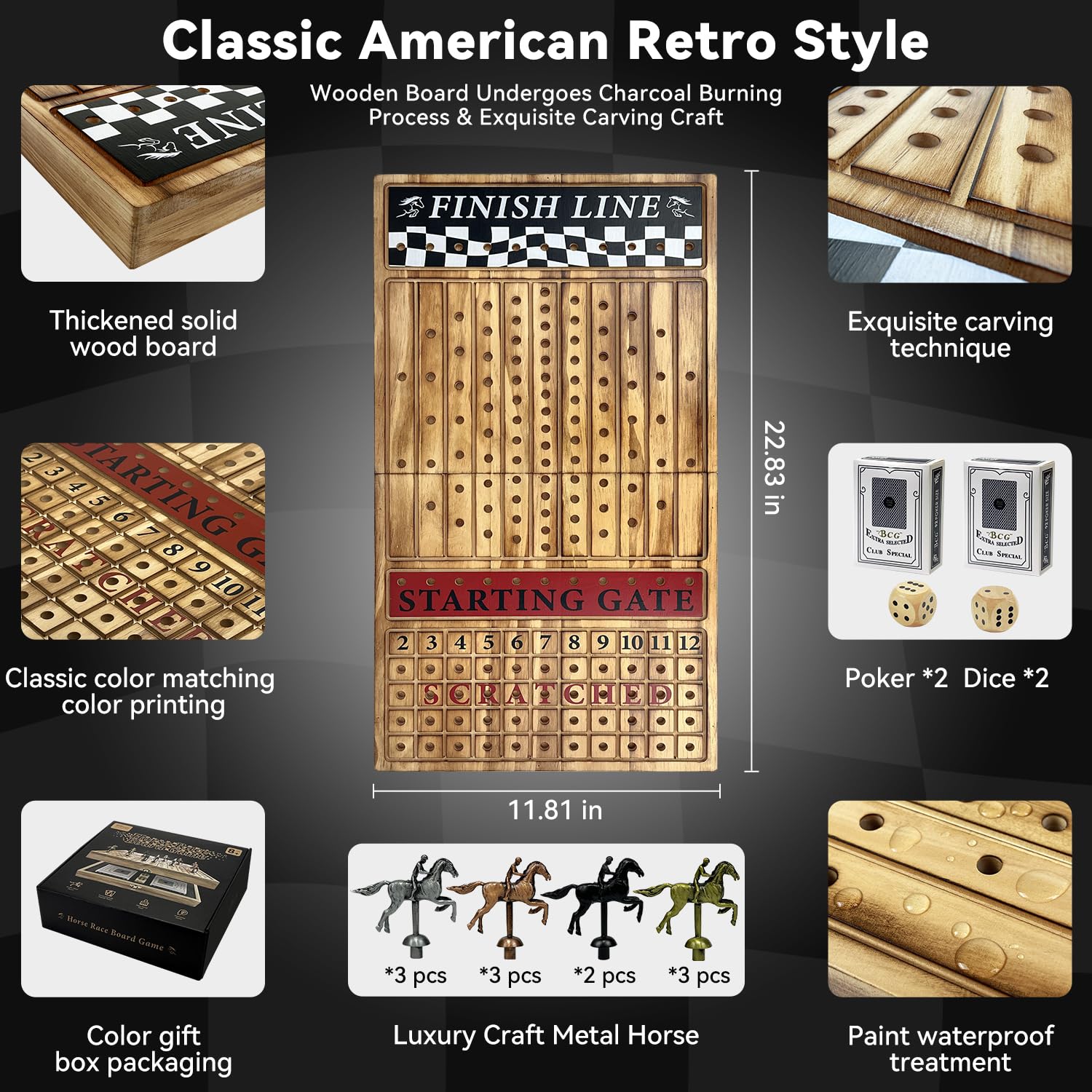 - [23-Inch Wooden Horseracing Board Game] Large size: 23 x 12 inch. This horse race board is crafted with specially charcoal firing process to ensure entire board looks more vintage and longevity. Moreover, the exterior of the game board is coated with a waterproof layer that prevents deformation or corrosion