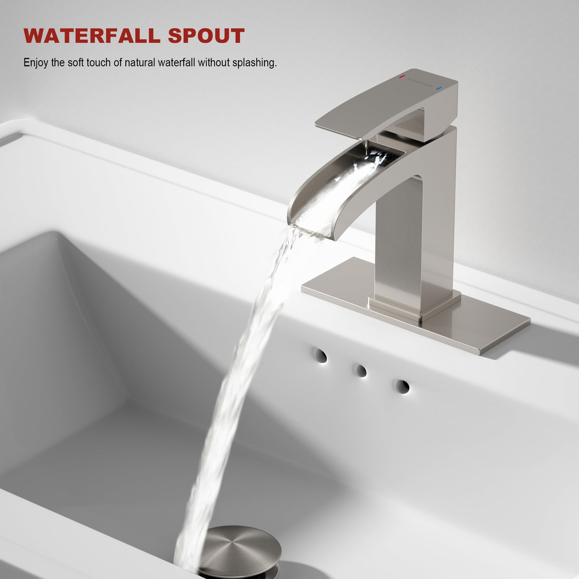 Lavatrum Brushed Nickel Bathroom Faucet Waterfall, Vanity Faucet Brass for Sink 1 Hole Single Handle Modern Mixer Tap with Pop-up Drain Stopper for Lavatory Farmhouse RV