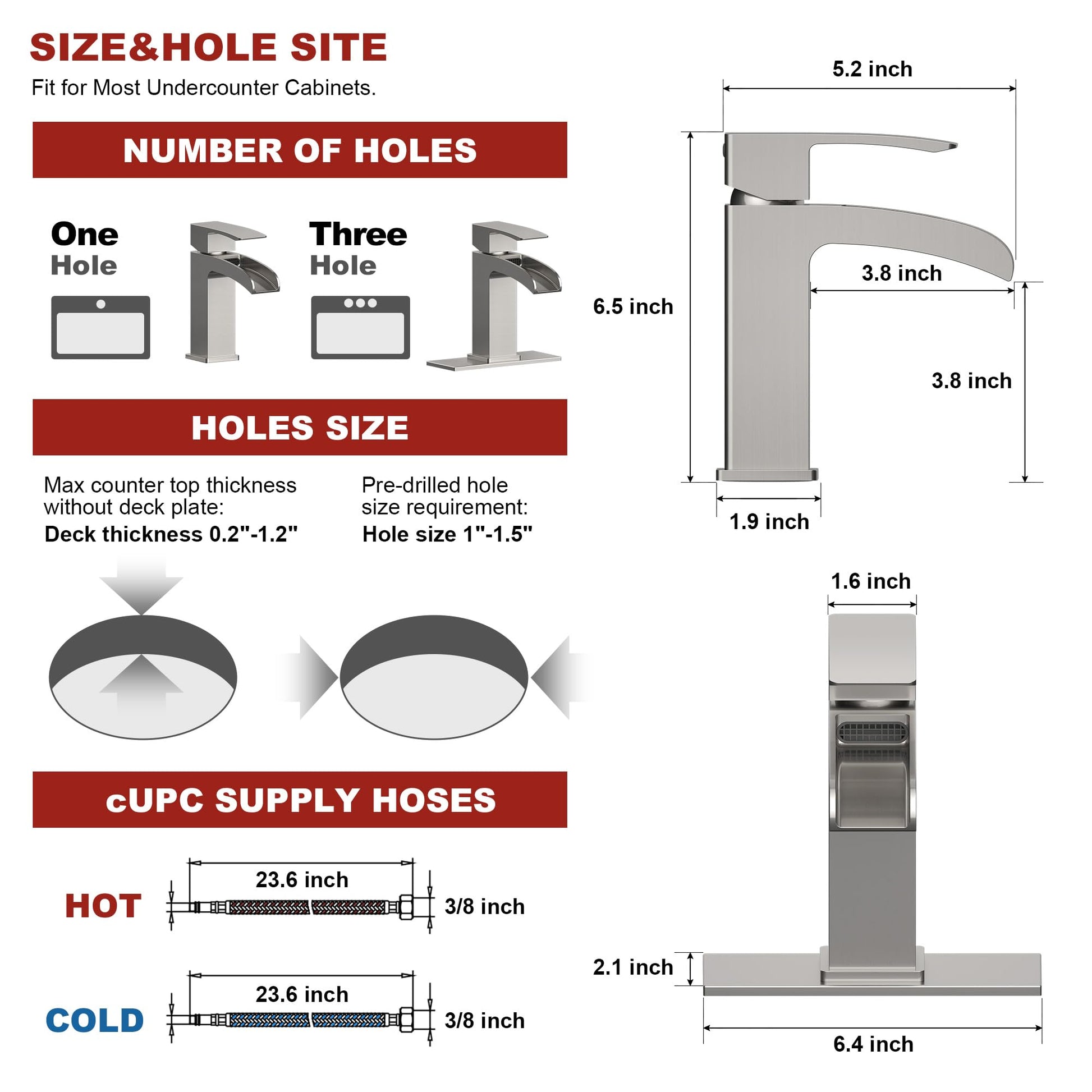 - Simple Installation: All-metal fitting assembly ensures long-lasting performance without sliding, while pre-installed water supply lines integrated into the faucet eliminate one potential leak point. Flexible supply lines are included for faster and easier installation, designed specifically for 1 or 3 holes installation. (three-hole escutcheon included)