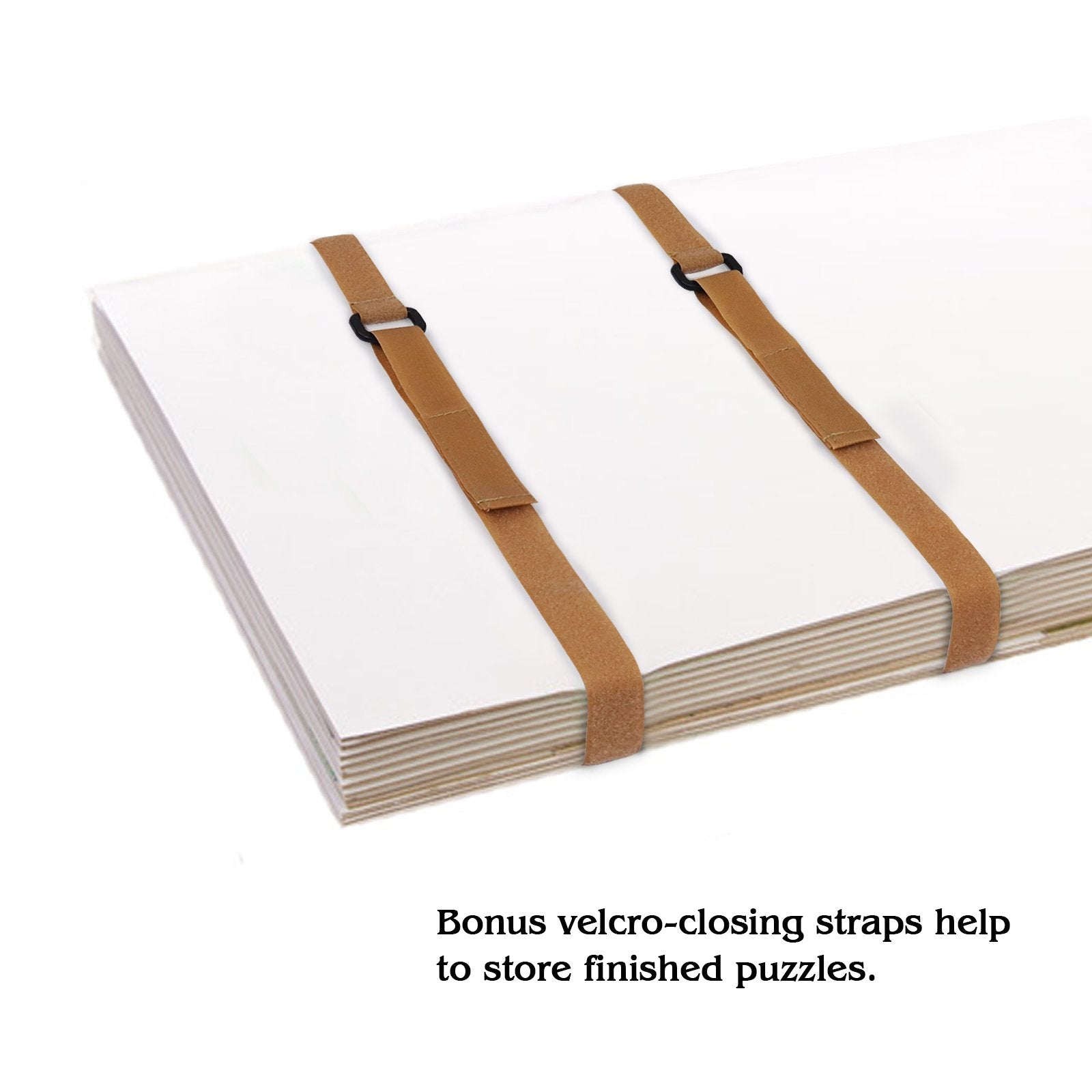 - Bonus 2 Storage Straps - 2 storage straps with velcro closures help to store finished puzzles. If you have more than several boards of puzzles, just stack the boards up and tighten them with the straps to prevent puzzles form breaking apart.