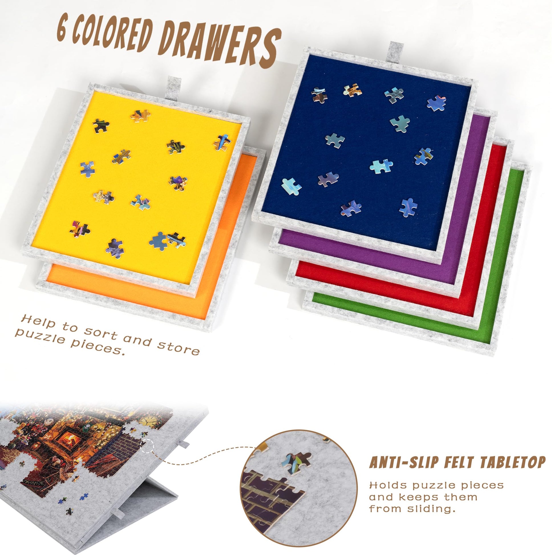 - 6 Colored Drawers - Six sliding drawers provides extra storage space for unused puzzle pieces and allow you to sort them by the color, theme or rim. Each drawer is designed with a handle for easily pulling it out. Also stay closed while not in use and leave you no worry about missing pieces.