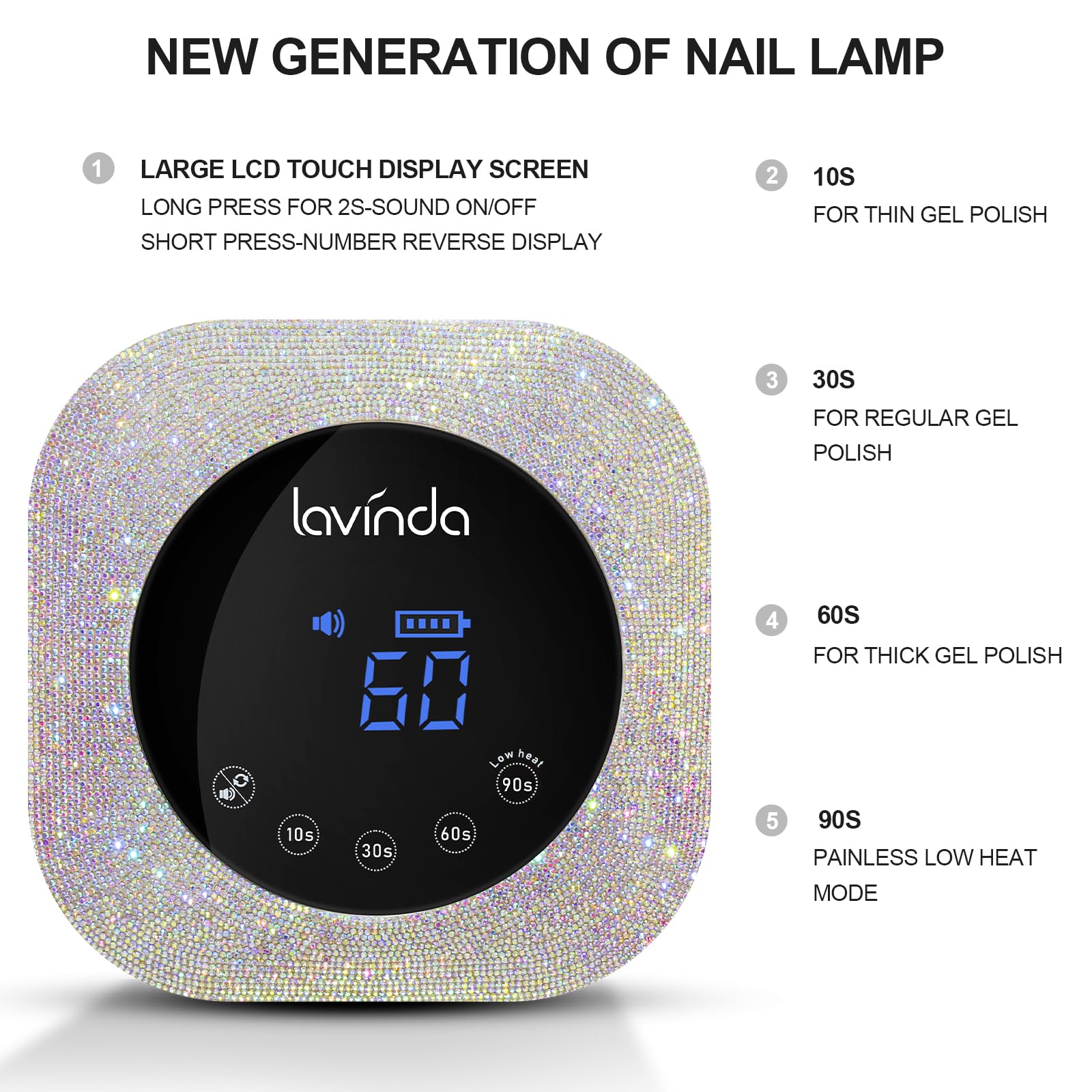 - 【Curing All Gel Nail Polishes】 This nail dryer can fast cure with all nail gel brands, e.g. Base Coat, Top Coat, Color Gel, Hard Gels, Poly Gels, Builder, Acrylic, Sculpture gel, gem glue, etc.(not for regular nail polish.) Enjoy high-quality salon manicures at home with your friends and family. If you have any problem with the Lavinda UV led nail lamp, please contact us through "contact sellers", and we will offer you a satisfactory solution within 24 hours.